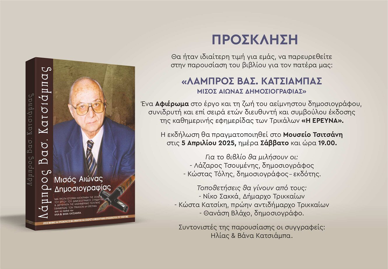 Στο Μουσείο Τσιτσάνη στα Τρίκαλα το Σάββατο 5 Απριλίου στις 7μ.μ. θα παρουσιαστεί το βιβλίο με τίτλο “Λάμπρος Κατσιάμπας, Μισός Αιώνας Δημοσιογραφίας”.