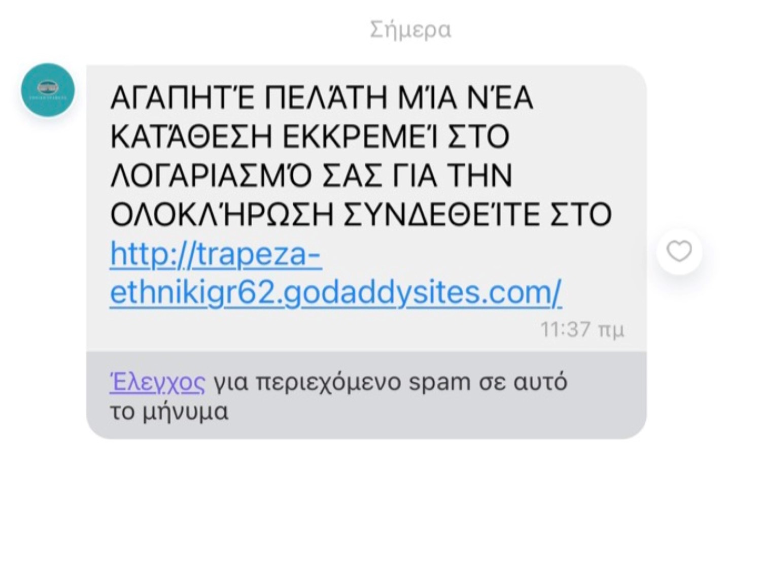 Προκειμένου να πληρώσουν έστειλαν το λινκ που φαίνεται στη φωτογραφία, με πλαστογραφημένο μήνυμα της Εθνικής Τράπεζας. Υποψιασμένος ο επιχειρηματίας επικοινώνησε αμέσως με την τράπεζα η οποία τον απέτρεψε από όποια ενέργεια, λέγοντάς του πως είναι απάτη – phising.