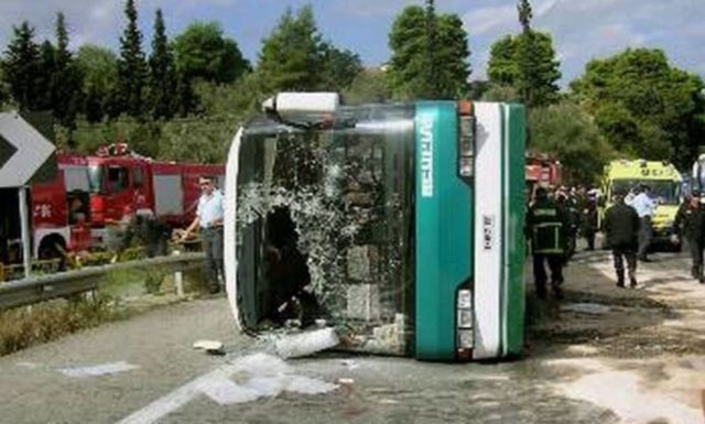 Στο 176ο χλμ. της εθνικής οδού, στο ύψος του Ασπρονερίου, ο οδηγός του φορτηγού, που βρισκόταν στο αντίθετο ρεύμα, έχασε τον έλεγχο. Το ρυμουλκούμενο, που μετέφερε σε κοντέινερ τζάμια, συγκρούστηκε πλαγιομετωπικά με το λεωφορείο. Και τα δύο οχήματα ανατράπηκαν.