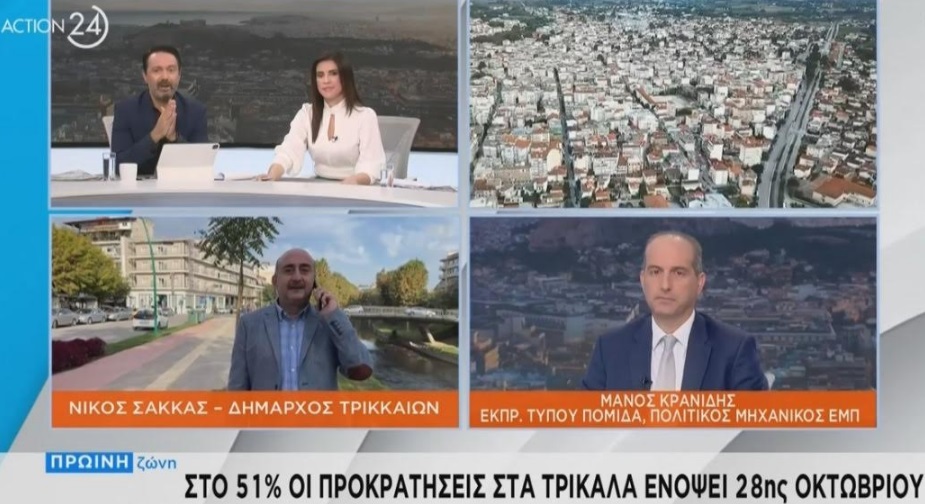 Απόδραση για την 28η Οκτωβρίου και προεργασία εν όψει του 12ου Μύλου των Ξωτικών, περιλάμβανε η συνέντευξη του Δημάρχου Τρικκαίων Νίκου Σακκά στο κανάλι Action24. Στην εκπομπή «Πρωινή Ζώνη» με τους Γιώργο Κακούση και Αννα Λιβαθυνού τονίστηκε από τον κ. Σακκά το ότι η πόλη και η ευρύτερη περιοχή ανακάμπτουν από τις πλημμύρες, υποδεχόμενες τους εκατοντάδες χιλιάδες επισκέπτες, αρχής γενομένης από το τριήμερο της 28ης Οκτωβρίου.
