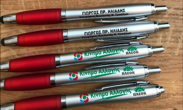 Θυμίζοντας παλιές καλές (ΠΑΣΟΚικές) εποχές ο υποψήφιος βουλευτής Τρικάλων του ΚΙΝ.ΑΛ. έβγαλε αναμνηστικά στυλό.