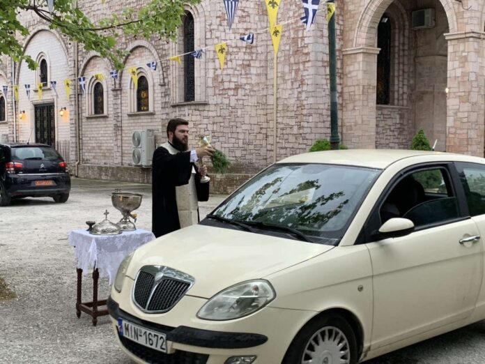 Όπως κατέγραψε το trikalavoice.gr ο Πρωτοσύγκελλος π. Αλέξιος Κανίνας και ο εις εκ των εφημερίων του Ναού π. Κωνσταντίνος Κούκος βγήκαν στο δρόμο και έραναν με Αγιασμό τα οχήματα ευχόμενοι να έχουν όλοι καλά ταξίδια.