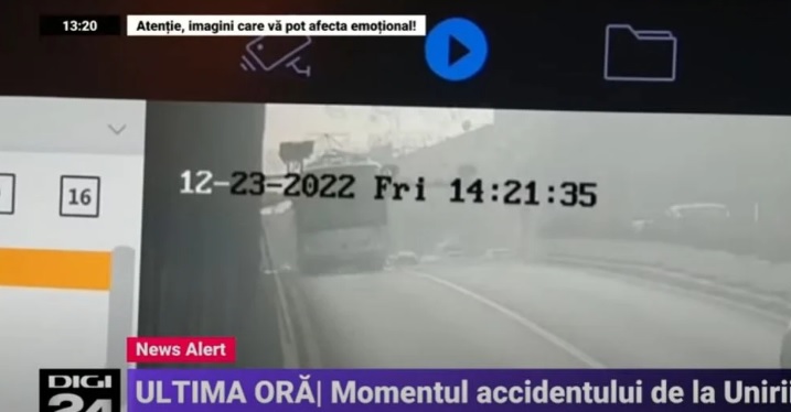 Σοκάρει το βίντεο-ντοκουμέντο από το τροχαίο δυστύχημα που σημειώθηκε στη Ρουμανία. Στο βίντεο, που έφερε στο φως το Romania TV, καταγράφεται η στιγμή που το μοιραίο λεωφορείο με τους Έλληνες ταξιδιώτες προσκρούει στην μεταλλική αψίδα, με αποτέλεσμα ένας 53χρονος από τη Λάρισα να χάσει τη ζωή του και άλλοι 24 άνθρωποι να τραυματιστούν.