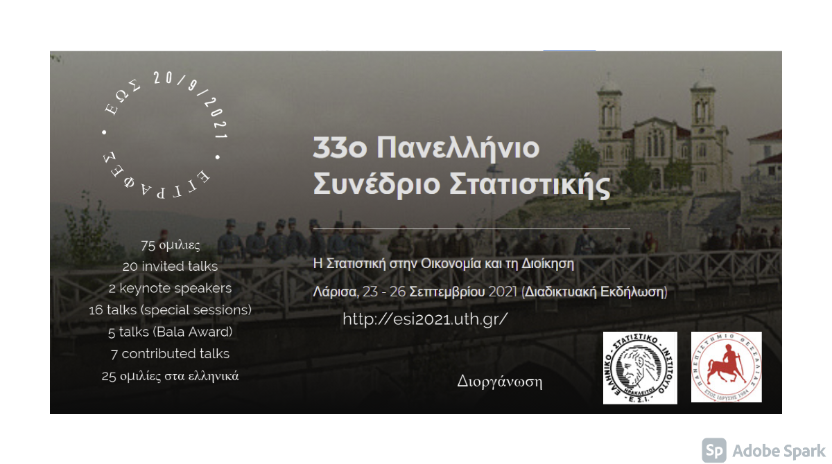 Το 33ο Πανελλήνιο Συνέδριο Στατιστικής στη Λάρισα με θέμα “Η Στατιστική στην Οικονομία και τη Διοίκηση”, και το οποίο πραγματοποιείται διαδικτυακά, ξεκίνησε τις εργασίες του χθες, Πέμπτη 23 Σεπτεμβρίου και θα διαρκέσει ως την Κυριακή 26 Σεπτεμβρίου, όπως αναφέρεται στο σχετικό Δελτίο Τύπου. Το Συνέδριο διοργανώνεται από το Τμήμα Διοίκησης Επιχειρήσεων και το Τμήμα Οικονομικών Επιστημών του Πανεπιστημίου Θεσσαλίας, ενώ συνδιοργανωτής είναι το Ελληνικό Στατιστικό Ινστιτούτο.