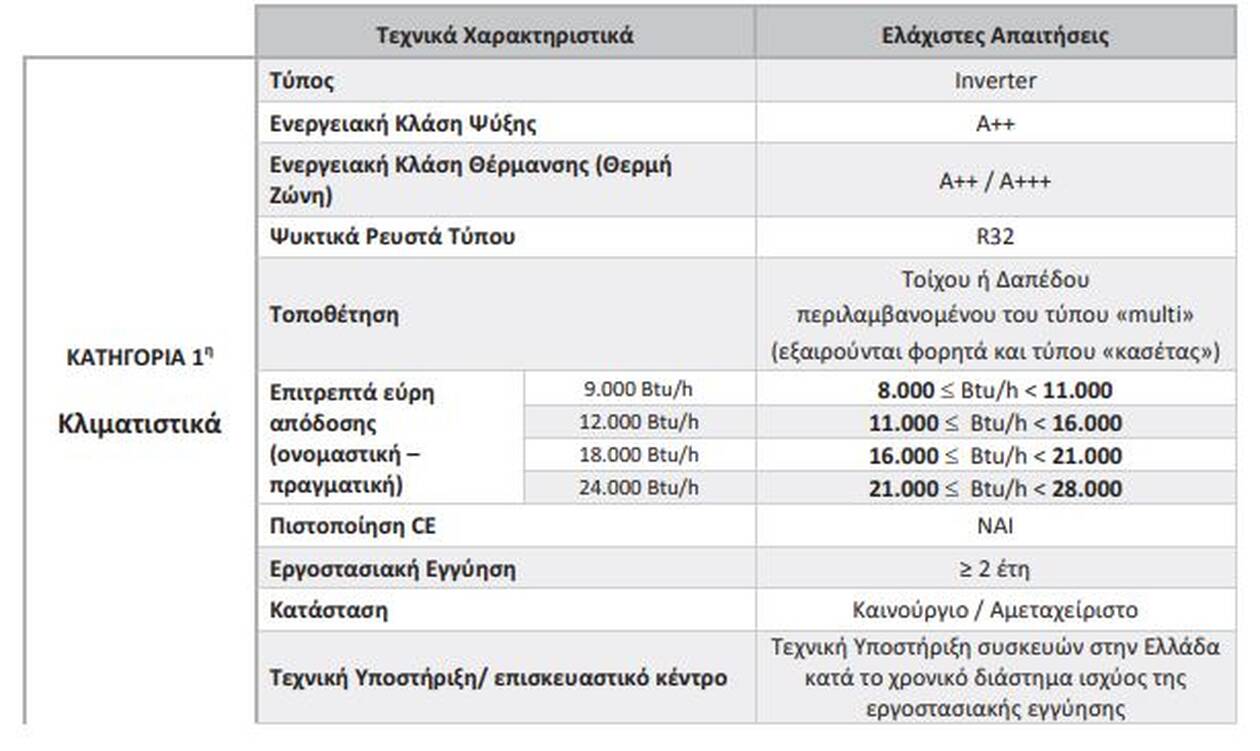 Το πρόγραμμα επιδότησης ηλεκτρικών συσκευών επιχορηγεί την αγορά των ακόλουθων κατηγοριών ηλεκτρικών συσκευών με τα αντίστοιχα ελάχιστα χαρακτηριστικά.