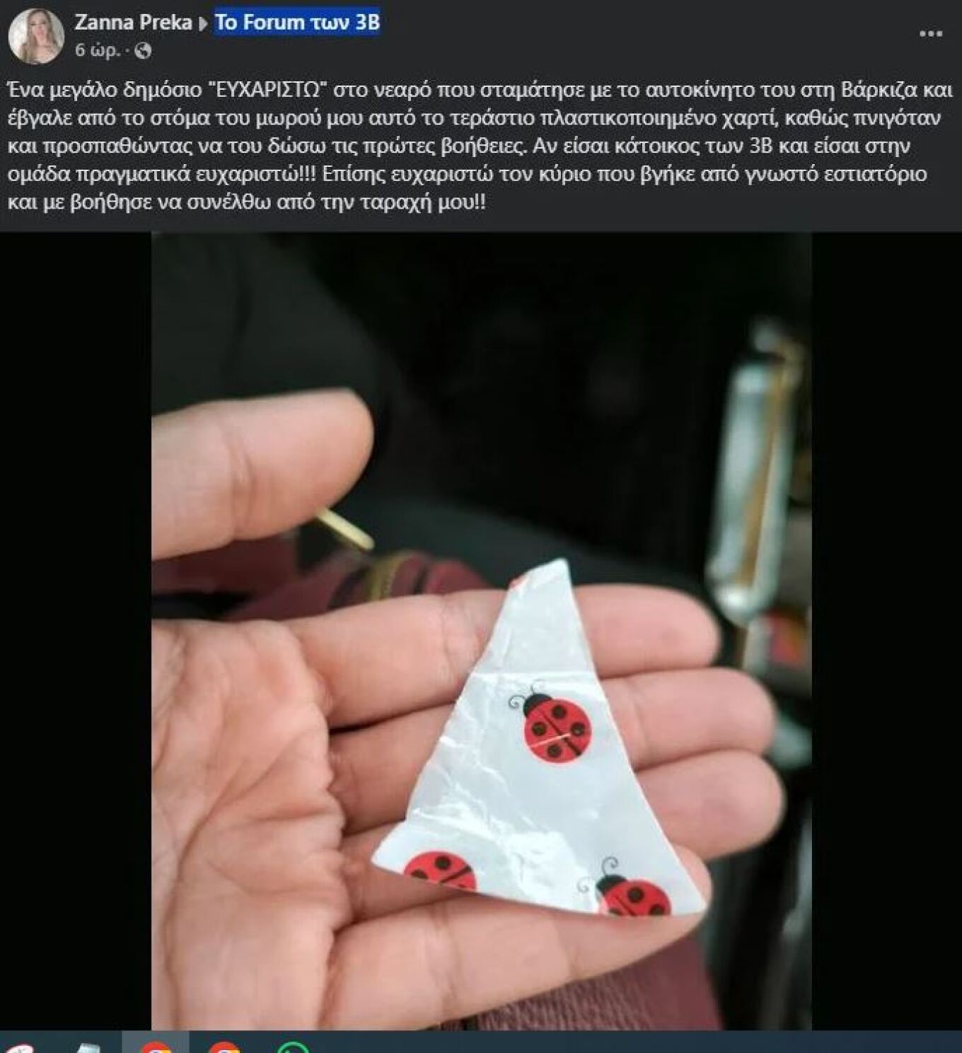 Η περιπέτεια της μητέρας έγινε γνωστή με ανάρτησή της στο Facebook στην οποία εξέφρασε το δημόσιο ευχαριστώ της και στον νεαρό που τη βοήθησε και σε έναν άλλο κύριο που βγήκε από εστιατόριο και τη βοήθησε να συνέλθει.