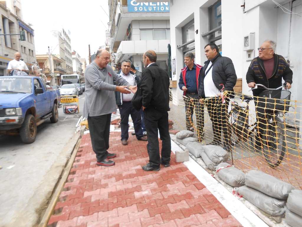 Ο δήμαρχος, συνοδευόμενος από τον αντιδήμαρχος Τεχνικών Υπηρεσιών Θανάση Σταυρίδη και υπηρεσιακά στελέχη, πήγε στο σημείο ολοκλήρωσης της εσοχής, στην οποία τοποθετήθηκαν καινούργια ρείθρα, που διαχωρίζουν το πεζοδρόμιο από τη θέση στάθμευσης, ενώ στο σημείο της εσοχής τοποθετήθηκαν κόκκινα τούβλα.