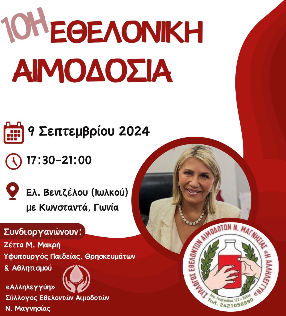 Εθελοντική αιμοδοσία διοργανώνει η υφυπουργός Παιδείας, Ζέττα Μακρή, μαζί με τον Σύλλογο Εθελοντών Αιμοδοτών «Αλληλεγγύη» την ερχόμενη Δευτέρα.