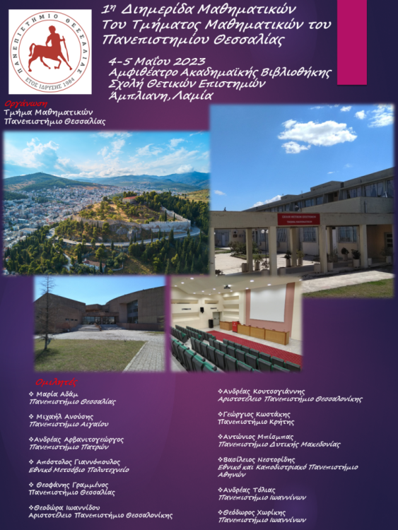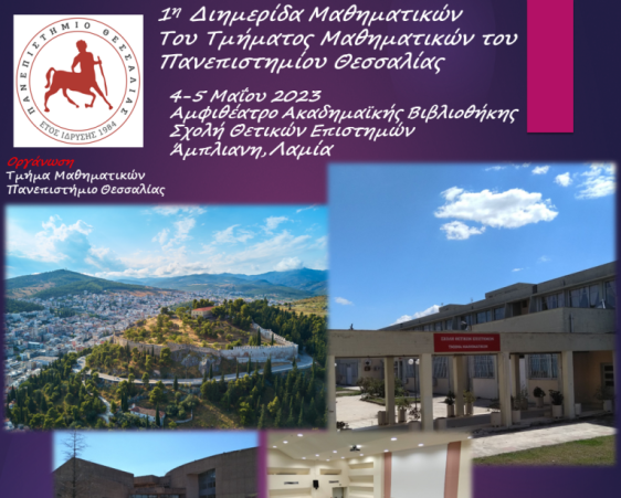Το Τμήμα Μαθηματικών του Πανεπιστημίου Θεσσαλίας πραγματοποιεί στις 4 & 5 Μαΐου την 1η Διημερίδα Μαθηματικών, με διαλέξεις από διακεκριμένες και διακεκριμένους επιστήμονες από Πανεπιστημιακά Τμήματα της Ελλάδας.