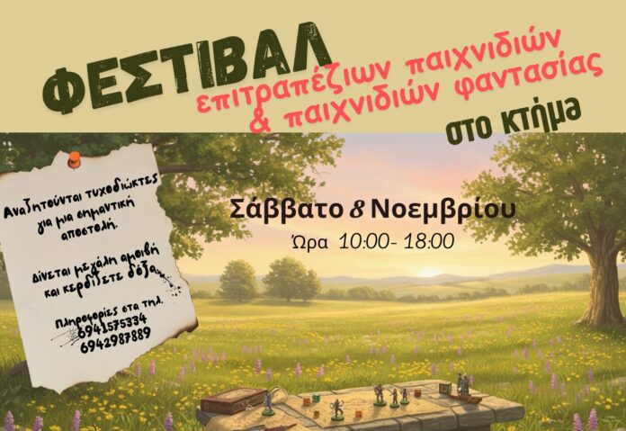 Στον Βόλο θα πραγματοποιηθεί το Σάββατο 8 Νοεμβρίου το πρώτο Φεστιβάλ επιτραπέζιων παιχνιδιών και παιχνιδιών φαντασίας. Ειδικότερα η «ζΒόλος» – ΚοινΣΕπ, ο Σύλλογος Επιτραπέζιων Παιχνιδιών Game-A-Lot Guild, το κατάστημα παιχνιδιών Roll’n’Trade και η Λέσχη Ειδικών Δυνάμεων Ν.Μαγνησίας προσκαλούν τους λάτρεις των επιτραπέζιων να περάσουν μία μοναδική μέρα ταξιδεύοντας σε κόσμους φανταστικούς και γνωρίζοντας ήρωες μυθικούς!