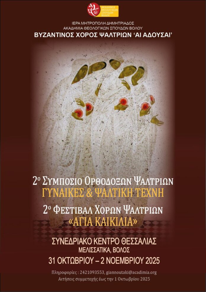 Το 2ο Διεθνές Συμπόσιο Ψαλτριών Ορθόδοξου ανατολικού μέλους και το 2ο Φεστιβάλ Χορών Ψαλτριών Αγία Καικιλία θα πραγματοποιηθούν στον Βόλο, το τριήμερο από 31 Οκτωβρίου έως 2 Νοεμβρίου 2025.