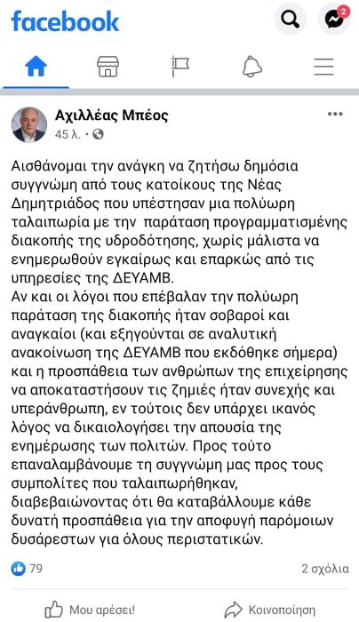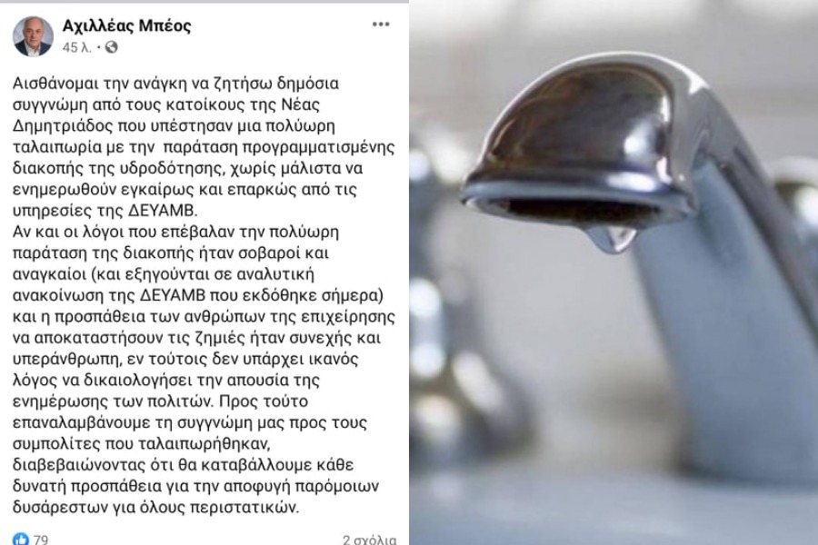 Σχεδόν ένα 24ωρο χωρίς νερό είχαν μείνει κάτοικοι της Ν. Δημητριάδας, μετά την παράταση των έργων και την βλάβη που υπέστη το δίκτυο της ΔΕΥΑΜΒ. Εκ των υστέρων και μετά από τα πάμπολλα παράπονα των κατοίκων, καθώς ολόκληρα νοικοκυριά έμειναν χωρίς σταγόνα νερό και μάλιστα χωρίς καμία επίσημη ενημέρωση, για τους λόγους της παράτασης της προγραμματισμένης διακοπής, ο Αχ. Μπέος αποφάσισε να ζητήσει συγνώμη για την ταλαιπωρία τους μέσω… facebook.