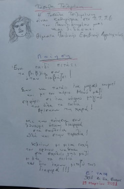 Οι μαθητές/τριες με έργα τους τίμησαν την Άλκηστις Κοντογιάννη που εισήγαγε στο ελληνικό παιδαγωγικό σύστημα τις αρχές της δραματικής τέχνης στην εκπαίδευση και τους Τασούλα Τσιλιμένη και Βασίλη Αναγνωστόπουλο για τις ποιητικές δημιουργίες που βοηθούν στην εξάλειψη των διακρίσεων.