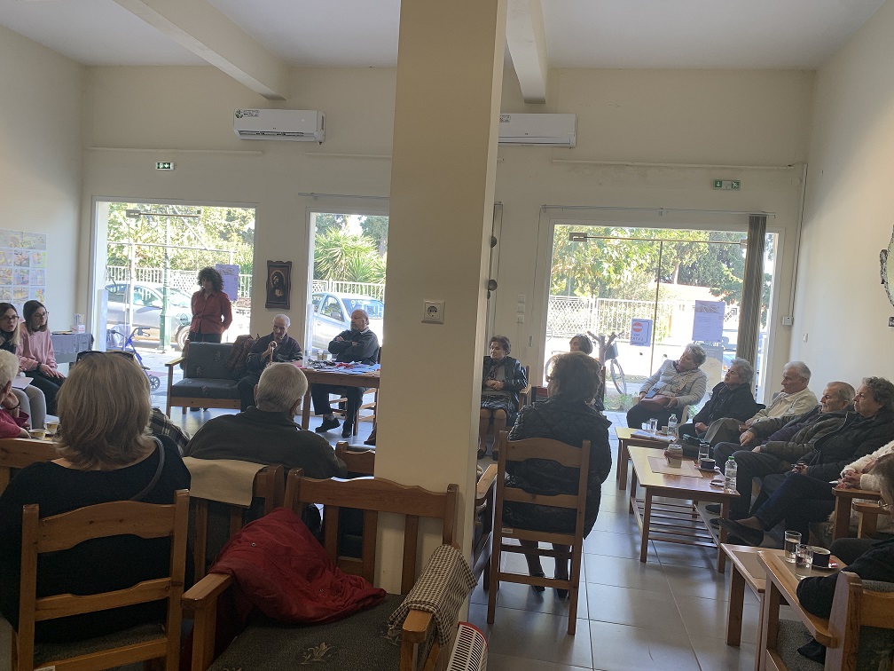 Η δράση αφορούσε στην ενημέρωση και ευαισθητοποίηση των ωφελούμενων σχετικά με την κατάθλιψη στην τρίτη ηλικία. Συζητήθηκαν οι παράγοντες κινδύνου, οι τρόποι αντιμετώπισης και η συμπτωματολογία που πρέπει να γίνει έγκαιρα ανιχνεύσιμη από το οικογενειακό περιβάλλον. Επίσης έγινε αναφορά στην κινητή μονάδα ψυχικής υγείας, με την οποία συνεργάζεται η ΤΟΜΥ και μπορούν να αντιμετωπίσουν από κοινού ζητήματα ψυχικής υγείας.