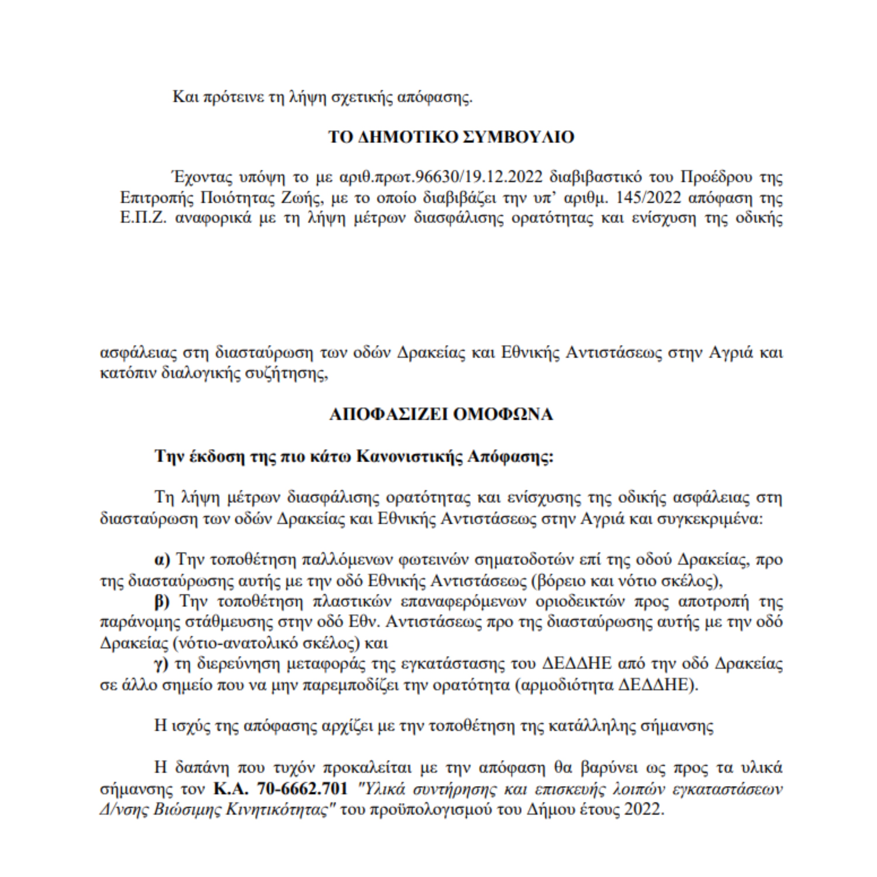 Μετά το συμβάν του Νοεμβρίου με τον κ. Μουλά, το Δημοτικό Συμβούλιο Βόλου αποφάσισε ότι θα τοποθετηθεί στο σημείο φωτεινός σηματοδότης. «Απ’ ότι μου είπαν θα βάλουν φωτεινούς σηματοδότες. Μετά το συμβάν με τον κ. Μουλά τον Νοέμβριο, προσπάθησα να κλείσω κάποιο ραντεβού με το γραφείο Δημάρχου, δεν μπόρεσα, τελικά μίλησα με κάποιον από το γραφείο Δημάρχου, ενδιαφέρθηκε, κινητοποιήθηκε στις γιορτές, περάσανε κορύνες και πιο έντονες διαβάσεις με το Stop, αλλά δεν αρκούν, μέχρι που έγινε το τρακάρισμα και αγανακτισμένη πήγα να μιλήσω με τον/την Εισαγγελέα υπηρεσίας» τόνισε η κ. Αθανασία και υπογράμμισε πως ποτέ δεν είδε τον/την Εισαγγελία γιατί δεν την δέχτηκε.