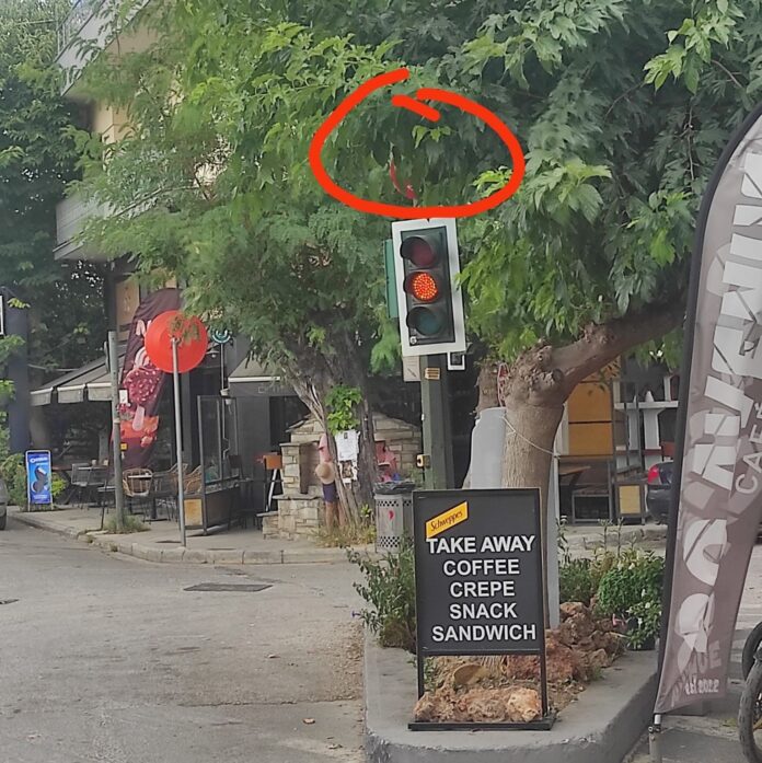 Σύμφωνα με τα όσα αναφέρει κάτοικος της περιοχής σε ανάρτησή του σε μέσο κοινωνικής δικτύωσης, τα κλαδιά του δέντρου πίσω από τον φωτεινό σηματοδότη, κρύβουν την πινακίδα κυκλοφορίας που ορίζει ότι απαγορεύεται η στροφή προς τα αριστερά.