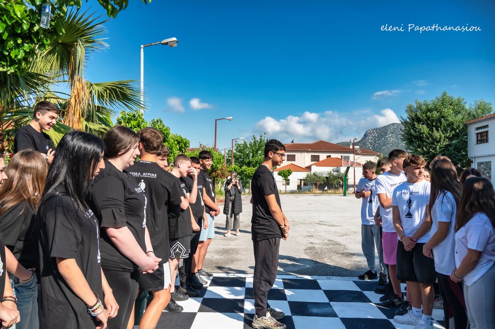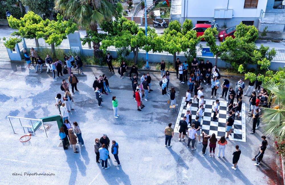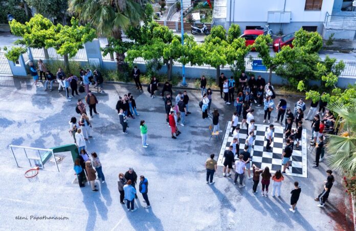 Όμως δεν έμειναν μόνο εκεί, καθώς με μπροστάρηδες τα παιδιά, δημιούργησαν στην αυλή του σχολείου σκακιέρα και μαθητές έπαιξαν βιωματικά σκάκι, συνοδεία της μουσικής του αξεπέραστου Βαγγέλη Παπαθανασίου, φορώντας μάλιστα και ανάλογα μπλουζάκια.