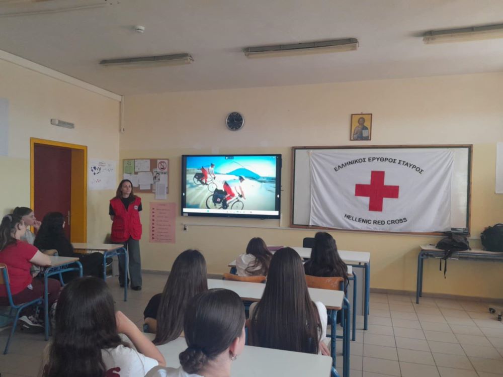 Οι δύο εκπαιδεύτριες επισκέφθηκαν το σχολείο για δεύτερη φορά φέτος και συγκεκριμένα προσκεκλημένες από τον Τομέα Υγείας Πρόνοιας και Ευεξίας προκειμένου να ενημερώσουν τους μαθητές/τριες σε θέματα που αφορούν στις Α΄ Βοήθειες, την ΚΑΡΠΑ, αλλά και τη σπουδαιότητα του εθελοντισμού, καθώς η 8η Μαΐου ήταν Παγκόσμια Ημέρα του Ερυθρού Σταυρού.