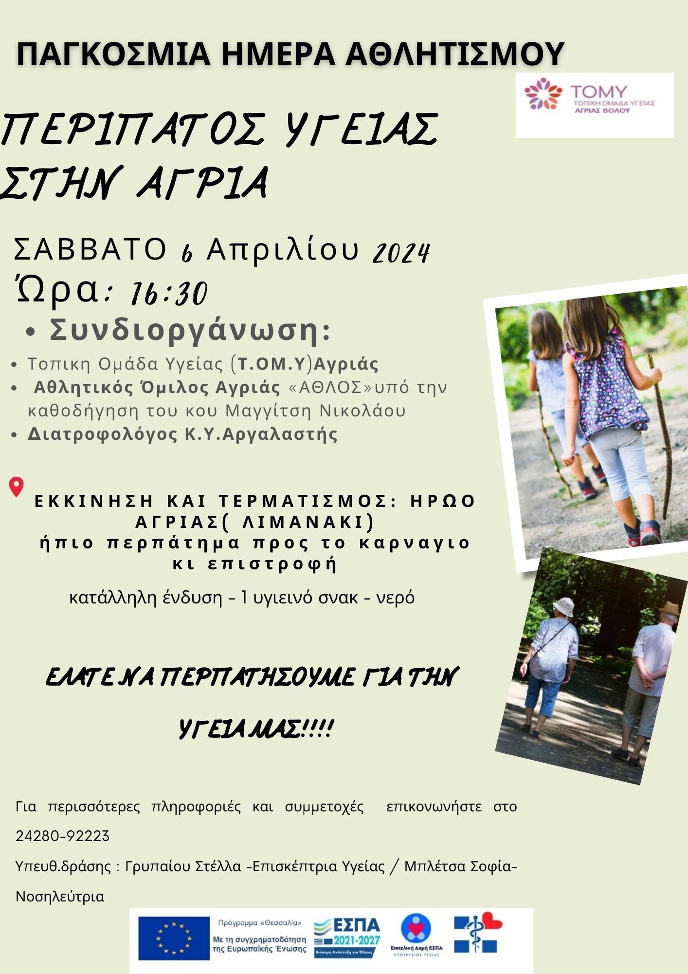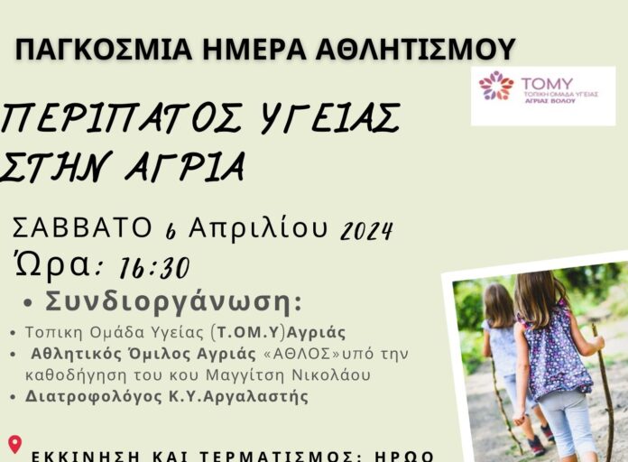 Με αφορμή την Παγκόσμια Ημέρα Αθλητή που εορτάζεται κάθε χρόνο στις 6 Απριλίου, οι Επαγγελματίες Υγείας της ΤΟΜΥ Αγριάς θα συνδιοργανώσουν με τον Αθλητικό Όμιλο Αγριάς «ΑΘΛΟΣ» και τη διατροφολόγο του Κέντρου Υγείας Αργαλαστής κ. Νεοκλεία Χονδρογιάννη «Περίπατο Υγείας».