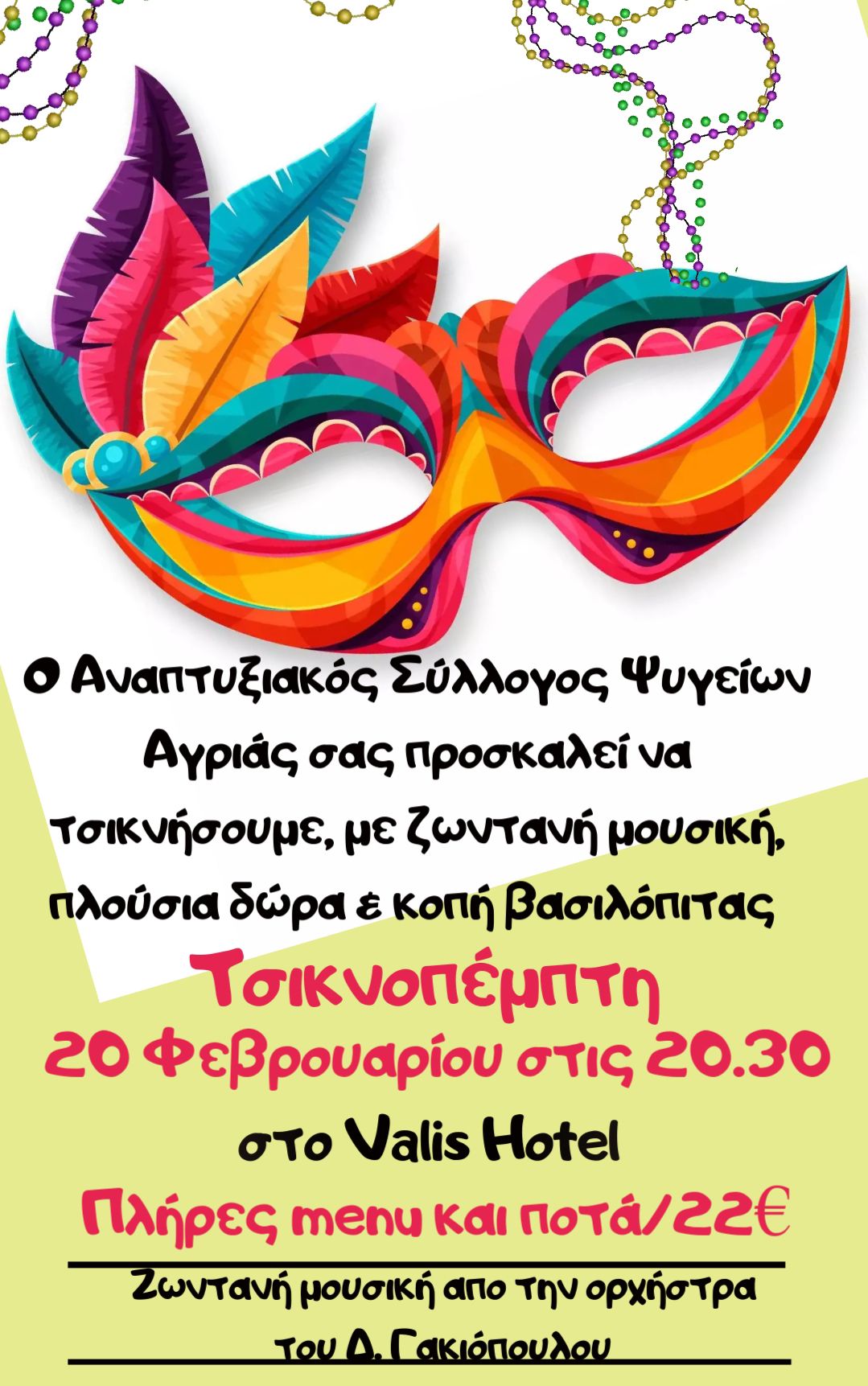 Εκδήλωση με ζωντανή μουσική, χορό, πλούσια δώρα και φαγητό διοργανώνει ο Αναπτυξιακός Σύλλογος Ψυγείων Αγριάς την Τσικνοπέμπτη 20 Φεβρουαρίου στις 20:30 στο ξενοδοχείο Valis στην Αγριά.