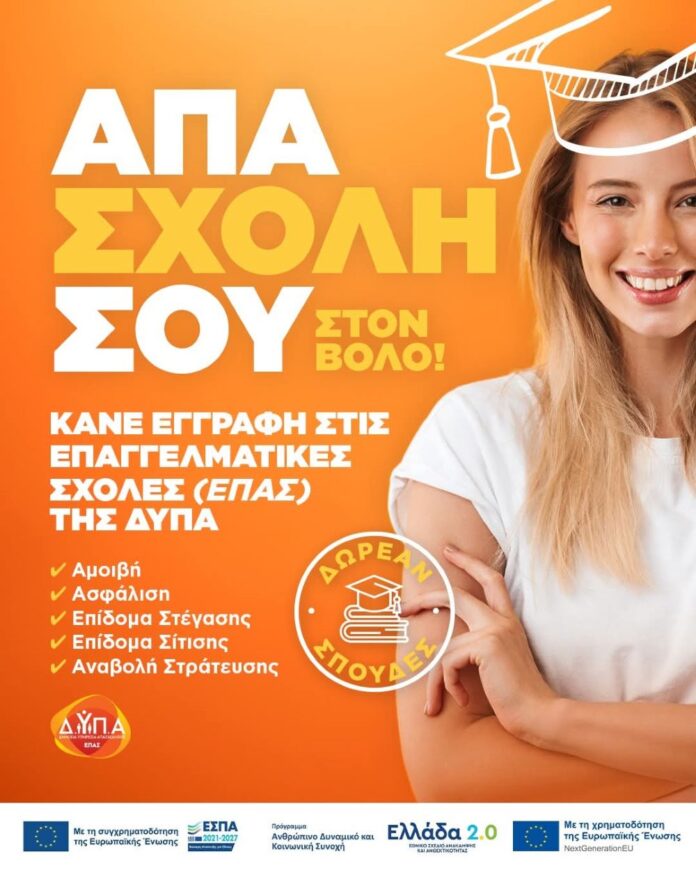 Συνεχίζονται οι αιτήσεις για εισαγωγή μαθητών στην ΕΠΑΣ Μαθητείας Βόλου, για σπουδές σε 10 ειδικότητες, με αμειβόμενη και ασφαλισμένη μαθητεία σε ειδικότητες με υψηλή ζήτηση στην αγορά εργασίας.