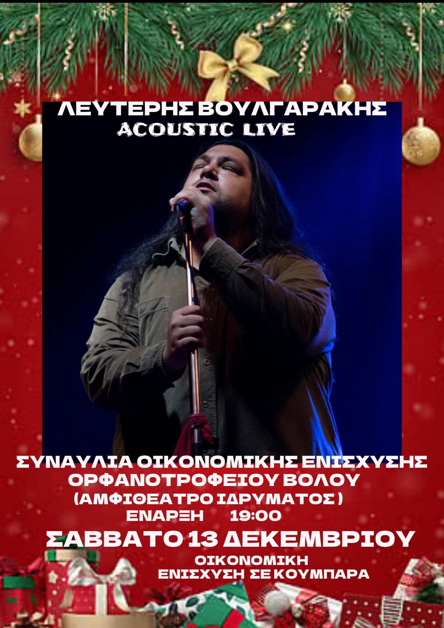 Ο ταλαντούχος Λαρισαίος ερμηνευτής Λευτέρης Βουλγαράκης, γνωστός από το συγκρότημα Εναλλάξ, ανταποκρίθηκε εθελοντικά και με δική του πρωτοβουλία, θα προσφέρει ένα μοναδικό acoustic live, γεμάτο έντεχνη μουσική, συναίσθημα και ατμόσφαιρα αγάπης.
