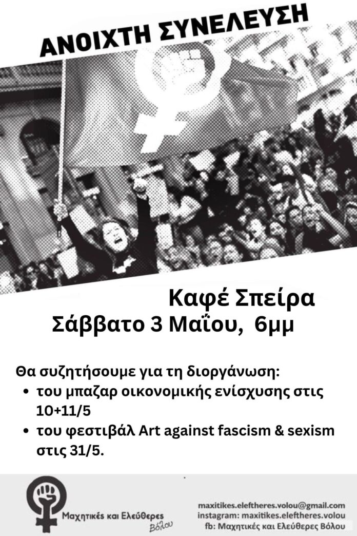 Ανοιχτή συνέλευση θα πραγματοποιήσουν οι Μαχητικές και Ελεύθερες Βόλου αύριο (Σάββατο, 3 Μάη) στη Σπείρα στις 6 μμ.