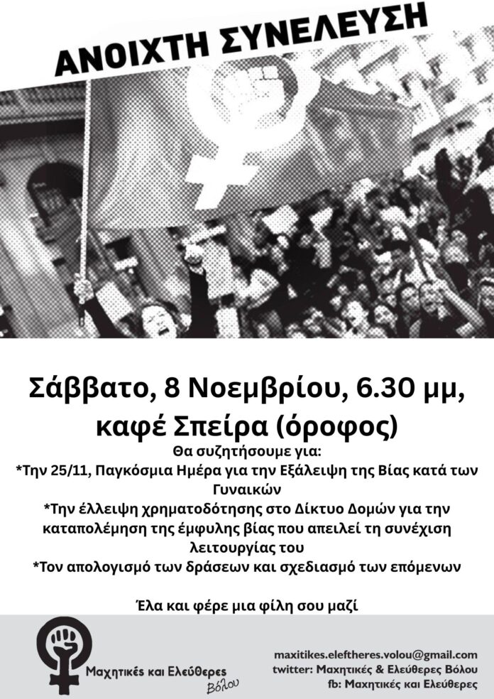 Ανοιχτή συνέλευση θα πραγματοποιήσουν οι “Μαχητικές και Ελεύθερες” σήμερα Σάββατο, 8 Νοεμβρίου, 6.30 μμ, καφέ Σπείρα (όροφος)