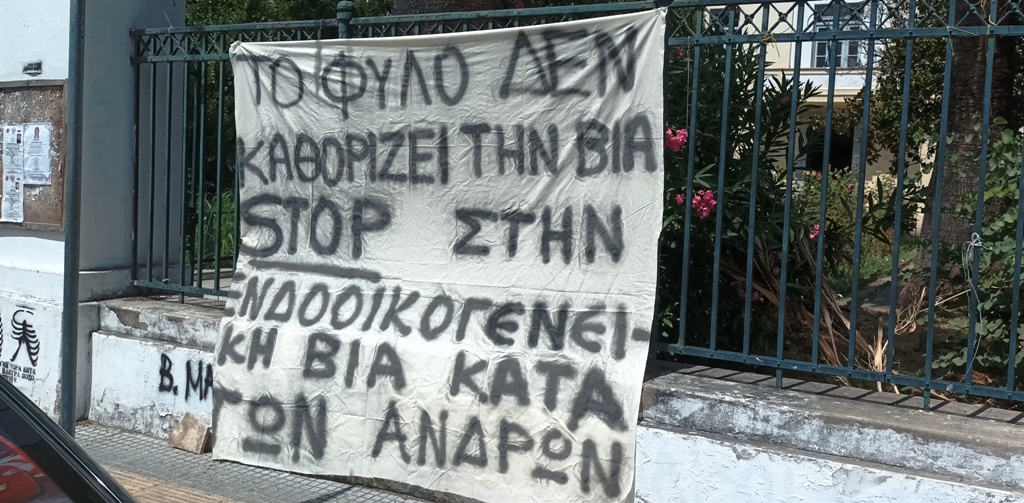 Στο αντίποδα, στην αίθουσα βρέθηκαν μερικές γυναίκες, της συλλογικότητας «Μαχητικές και Ελεύθερες», που επίσης ανάρτησαν πανό με το σύνθημα «το θύμα δεν είναι θύτης».