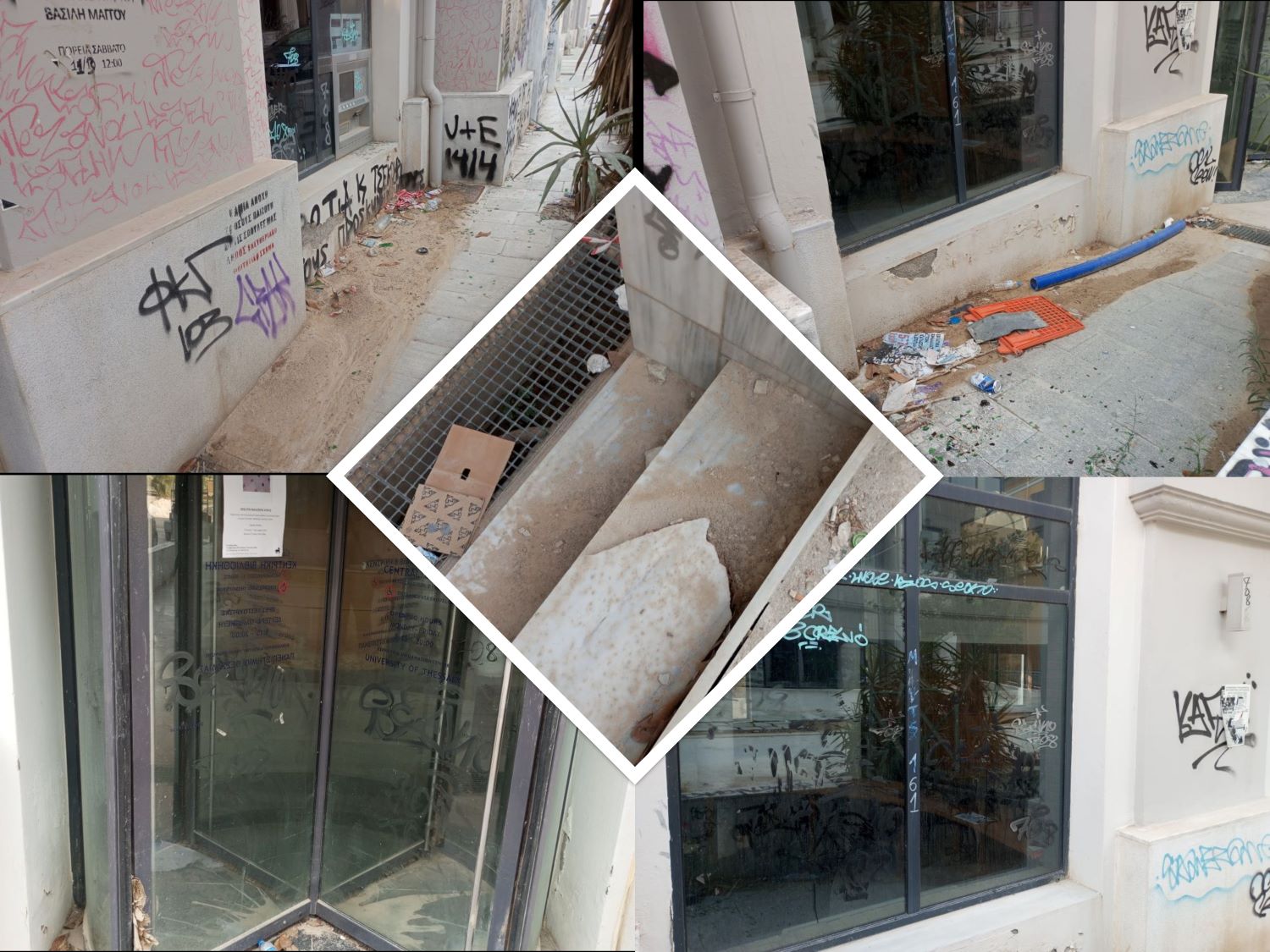 Σπασμένα μάρμαρα, σκουπίδια, χώμα από τις πλημμύρες του Daniel και του Elias, μέχρι και συνθήματα γραμμένα στα τζάμια της του ισογείου της βιβλιοθήκης αποτελούν το σκηνικό, που δεν αφήνει καλή εικόνα ιδίως στους τουρίστες, οι οποίοι κάνουν βόλτα στον πεζόδρομο της Ερμού.