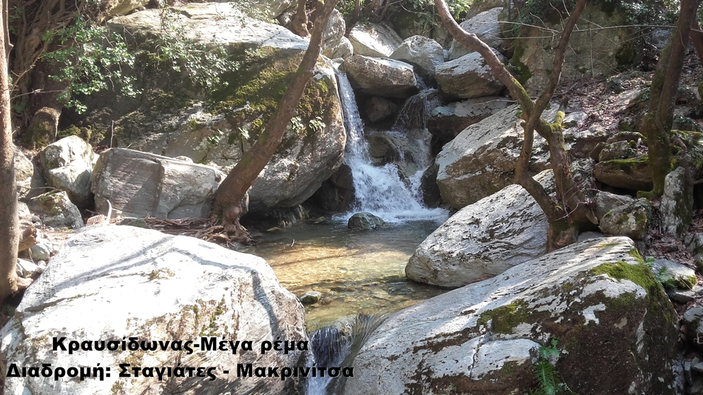 Κάποιοι και κάποιες της παρέας πάνε δεξιά προς Σταγιάτες [7], περπατώντας στο υπέροχο καλντερίμι που μεγάλο τμήμα του διατηρείται σε πολύ καλή κατάσταση. Έχετε αφήσει το χείμαρρο, φτάσατε στις Σταγιάτες. Το γάργαρο νερό της κοινόχρηστης βρύσης στην πλατεία σας υποδέχεται, όπως και η «Ανεξάρτητη Πηλιορείτικη Ομάδα Δράσης». Σας ενημερώνουν για τα νερά του Πηλίου, τον οικολογικό κήπο, για το πώς γίνεται το ψωμί σε παραδοσιακό ξυλόφουρνο και πολλά άλλα. Επισκέπτεστε το Μουσείο Τοπικής Ιστορίας, λίγη ξεκούραση, νερό και συνεχίζετε το ανηφορικό περπάτημα μέσα από το χωριό. Λίγο πριν το μοναστήρι του Ευαγγελισμού της Θεοτόκου παίρνετε το αριστερό μονοπάτι και κατηφορίζετε προς τη ρεματιά το «μέγα ρέμα», είστε πάλι στον Κραυσίδωνα [9]. Σταμάτημα για μια ανάσα και λίγο διάβασμα παίρνοντας ένα βιβλίο από τη δανειστική βιβλιοθήκη που βρίσκεται δίπλα στην ξύλινη γέφυρα που κατασκεύασαν οι κάτοικοι των Σταγιατών. Περνάτε από τη γέφυρα στην απέναντι όχθη, βαθιά ανάσα και παίρνετε το ανηφορικό μονοπάτι. Σε λίγο φθάνετε Μακρινίτσα [10]. Έχετε και εκεί πολλά να δείτε και να απολαύσετε, αποθανατίζοντας ολόκληρη την υπέροχη διαδρομή που πριν λίγο πραγματοποιήσατε. Δίπλα σας η Πορταριά [11] από την οποία ξεκινά το υπέροχο μονοπάτι για τα Χάνια Πηλίου, με αφετηρία πολλών άλλων μονοπατιών. Οι υπόλοιποι της παρέας που πήγαν; Έστριψαν αριστερά στην αντίθετη από τις Σταγιάτες διαδρομή. Έκαναν αναρρίχηση στα βράχια του Αγίου Νικολάκη; Κάποιοι ναι, κάποιοι συνέχισαν μέσα από τη χαράδρα για να βγουν στα Ταμπάκικα, στις ντριστέλες, να περάσουν το πέτρινο γεφυράκι και να βγουν Κουκουράβα [12] και μέσα από τα καλντερίμια να φτάσουν στη Μακρινίτσα. Εκεί ξανασυναντήθηκαν όλοι μαζί και έκαναν τον απολογισμό μιας υπέροχης διαδρομής, η διάρκειά της οποίας συνεχόμενα και με μικρές στάσεις, δεν ξεπέρασε τις τρεις ώρες. Κάποιοι θα πουν, μας βάζεις δύσκολα. Τα δύσκολα έχουν αξία, θέλουν αγώνα και συλλογική προσπάθεια. Όταν το καταφέρεις τότε λες, ναι πέτυχα κάτι, έβαλα και εγώ ένα λιθαράκι. Το ορεινό τμήμα του χειμάρρου Κραυσίδωνα είναι μια πραγματικότητα. Το πεδινό παραμένει όνειρο, όχι όμως ουτοπία. Δεν αρκεί λοιπόν να κοιτάζεις, πρέπει και να ξέρεις τι βλέπεις, να βιώνεις το χώμα που πατάς, να βάλεις και εσύ ένα λιθαράκι να γίνει το όνειρο πραγματικότητα!