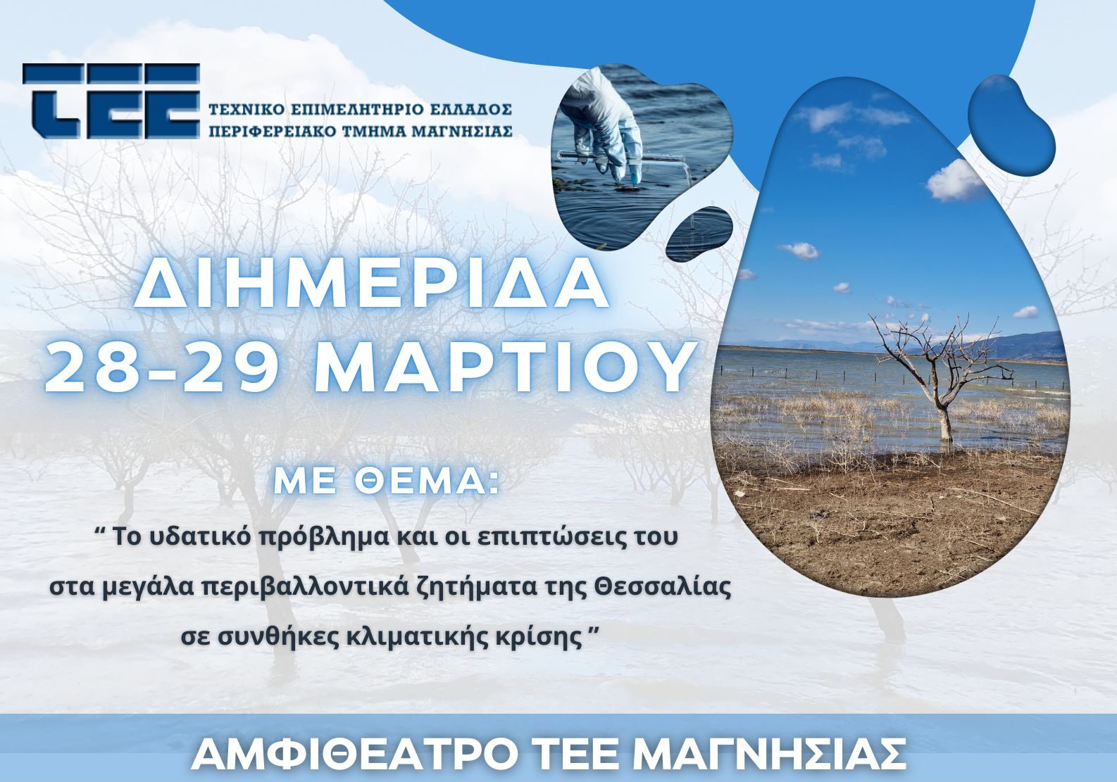 Πραγματοποιείται αύριο και το Σάββατο η διημερίδα με θέμα «Το Υδατικό πρόβλημα και οι επιπτώσεις του στα μεγάλα περιβαλλοντικά ζητήματα της Θεσσαλίας σε συνθήκες κλιματικής κρίσης», από το ΤΕΕ Μαγνησίας στο αμφιθέατρο του τοπικού τμήματος.