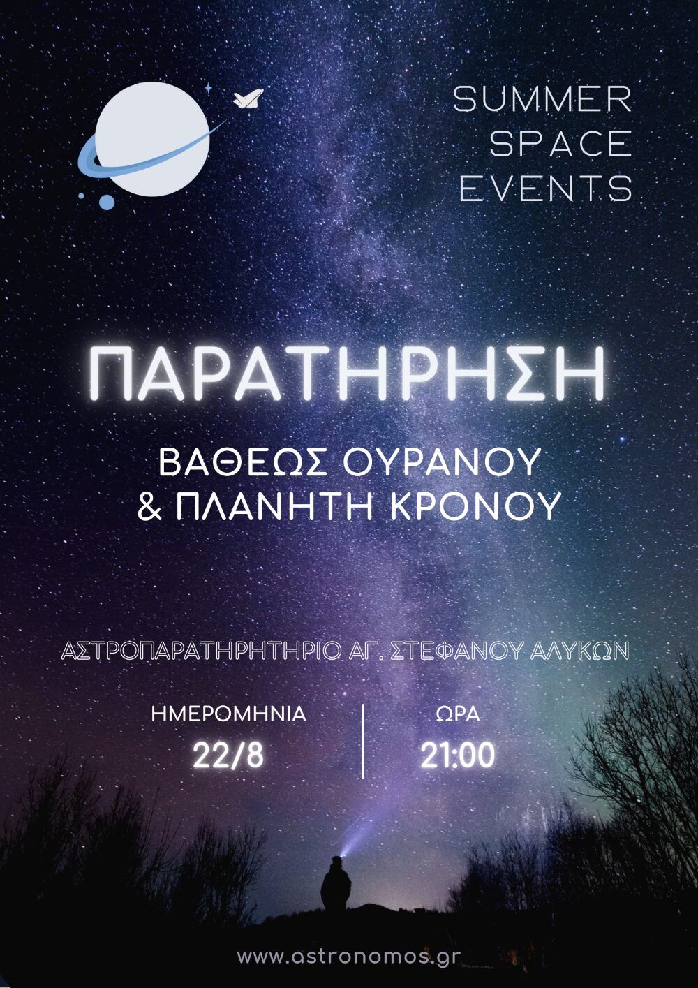 Η εκδήλωση θα περιλαμβάνει ουρανογραφία, παρατήρηση του πλανήτη Κρόνου, καθώς και αντικειμένων του βαθέως ουρανού.