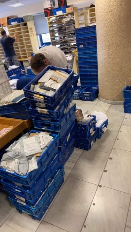 Απο τις φωτογραφίες φαίνονται οι τεράστιες στοίβες γραμμάτων, λογαριασμών και δεμάτων που ακόμη παραμένουν στο χώρο του Ταχυδρομείου, καθώς οι υπάλληλοι δεν επαρκούν για τις αυξημένες ανάγκες.