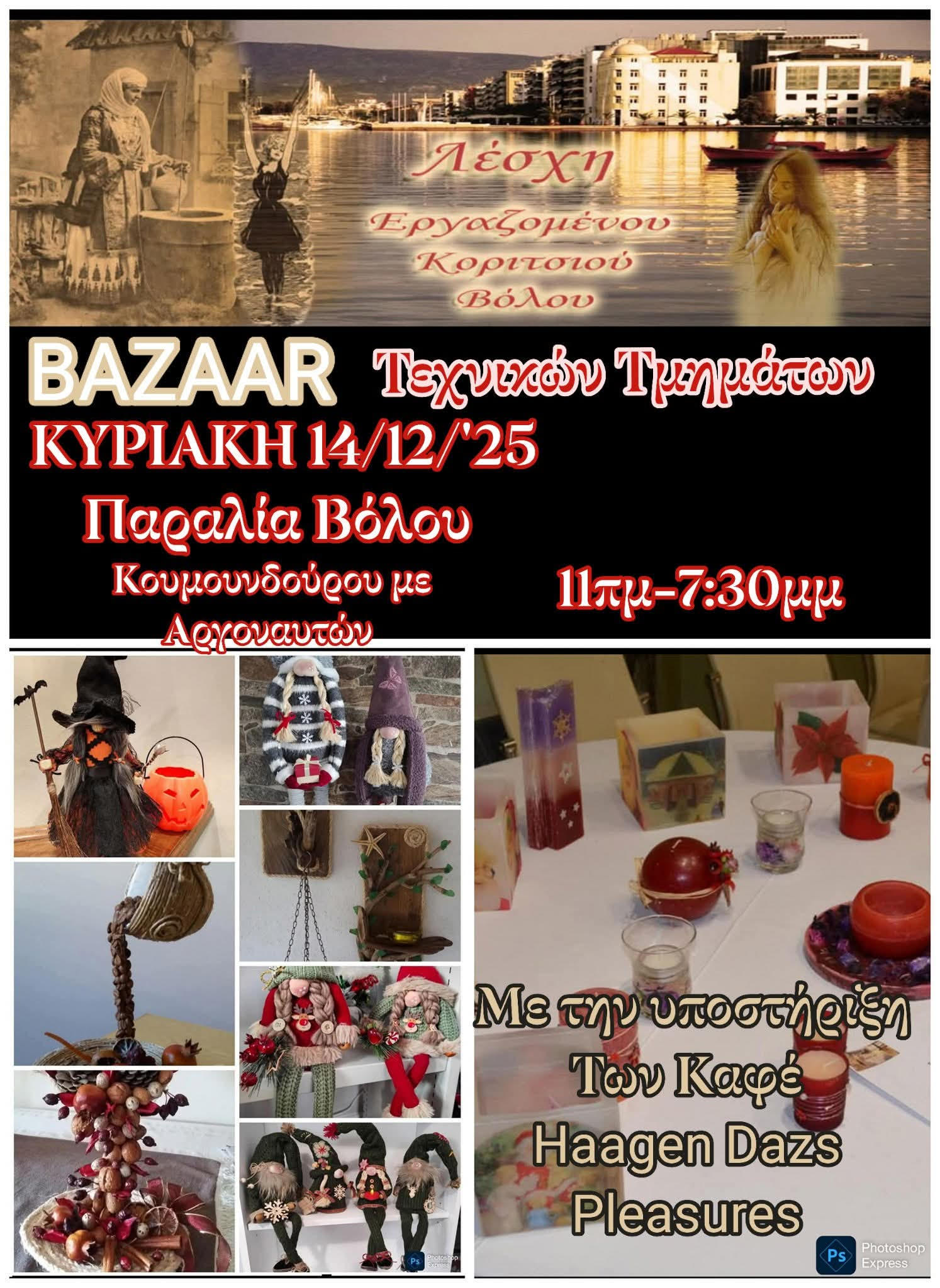 Bazaar θα πραγματοποιήσουν τα τεχνικά τμήμα της Λέσχης Εργαζόμενου Κοριτσιού Βόλου την ερχόμενη Κυριακή 14 Δεκεμβρίου από τις 11 το πρωί έως και τις 8 το βράδυ στην παραλία του Βόλου. Το bazaar θα πραγματοποιηθεί στο σημείο που διασταυρώνεται η Κουμουνδούρου με την Αργοναυτών.