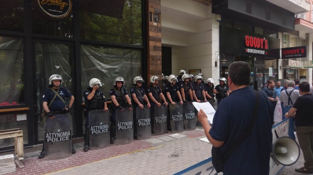 Το συμβολαιογραφικό γραφείο που έκανε τον ηλεκτρονικό πλειστηριασμό, βρέθηκε σε αστυνομικό κλοιό, ώστε να μη δημιουργηθεί επεισόδιο μεταξύ των αλληλέγγυων, μεταξύ των οποίων μέλη της ¨Πλεύσης Ελευθερίας”, της Λαϊκής Ενότητας και του Στεκιού Αλληλεγγύης για όλους που συγκεντρώθηκαν από το Βόλο και τη Λάρισα, για να συμπαρασταθούν στον επαγγελματία. Μπροστά από την είσοδο της πολυκατοικίας που στεγάζεται το γραφείο, υπήρχε διμοιρία υποστήριξης της Αστυνομίας και επιτρεπόταν η είσοδος μόνο στον πρόεδρος του ΕΚΒ Λάρισας, στον Μαργ. Πατσιαντά και στον δανειολήπτη για να συνεννοηθούν με την τράπεζα μέσω της συμβολαιογράφου.