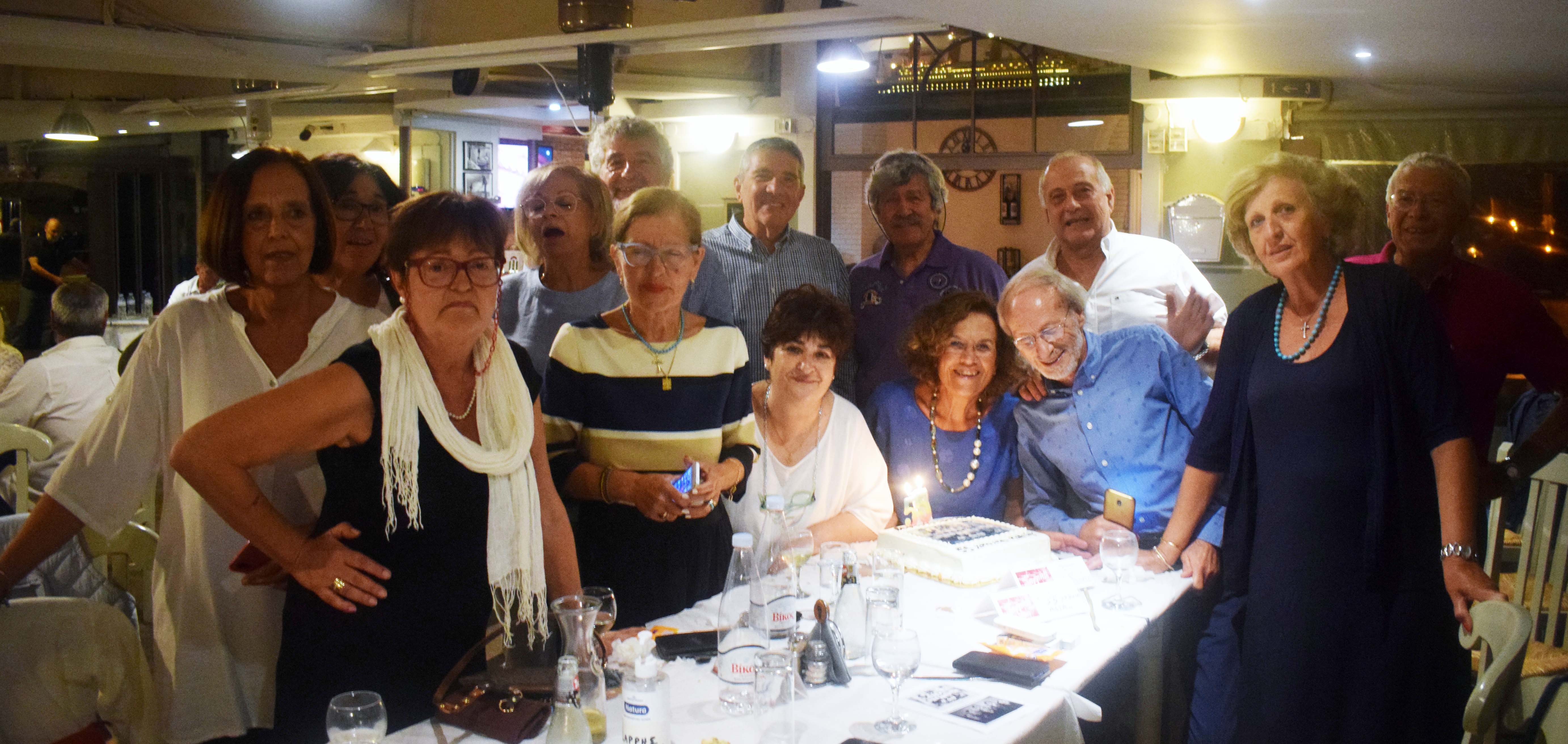 «Πέρασαν κιόλας 55 χρόνια, ούτε που το καταλάβαμε…», γράφαμε στα προηγούμενα Δελτία Τύπου και πράγματι, ήταν σαν να μην πέρασε μια μέρα. Δεκατέσσερα παιδιά, οκτώ κορίτσια (Άσπα, Βαρβάρα, Ευδοξία (Τίτσα), Κική, Μαρία, Όλγα, Ροδούλα, Σοφία) και έξι αγόρια (Βλάσης, Γιάννης, Δημήτρης Μ., Μανώλης, Στάθης, Χαράλαμπος) παρόντες/παρούσες και οι απόντες/απούσες σχεδόν όλοι/όλες με σοβαρή δικαιολογία – πέντε κορίτσια ζουν στην Αθήνα και ένα στην Κρήτη, δύσκολα τα ταξίδια με τον κορωνοϊό-μπαμπούλα. Οριστικά απόντες μόνο δύο: ο Σταύρος Σκουλής και ο Γιώργος Κοπατσάρης, ένα ποτηράκι κρασί στη μνήμη τους.