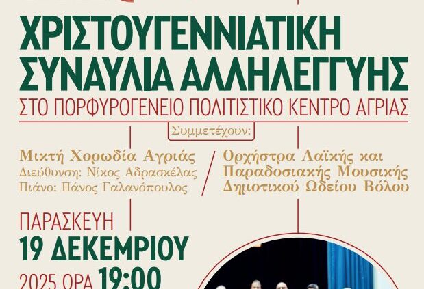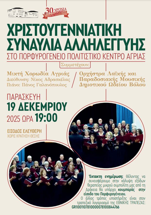 Το Πορφυρογένειο Πολιτιστικό Κέντρο Αγριάς γιορτάζει τα φετινά Χριστούγεννα τραγουδιστά, με παραδοσιακές μελωδίες του τόπου μας. Η Μικτή χορωδία Αγριάς που διευθύνει ο Νίκος Αδρασκέλας, με τον Πάνο Γαλανόπουλο στο πιάνο και η ορχήστρα Λαϊκής και Παραδοσιακής μουσικής του Δημοτικού Ωδείου Βόλου θα προσφέρουν στο κοινό ένα πλούσιο γιορτινό μουσικό πρόγραμμα, την Παρασκευή 19 Δεκεμβρίου και ώρα 19.00 στο θέατρο του Πορφυρογένειου Αγριάς.