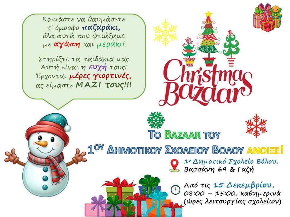 Το χριστουγεννιάτικο bazaar του 1ου Δημοτικού Σχολείου Βόλου ανοίγει τις πόρτες του και φέτος στο κοινό. Οι καλλιτεχνικές δημιουργίες των μαθητών/-τριών και των εκπαιδευτικών του σχολείου περιμένουν τη στήριξή όλων. Τα εκθέματα του bazaar διατίθενται σε συμβολική τιμή, ενισχύοντας το σχολείο και τα παιδιά του αυτές τις γιορτινές ημέρες.