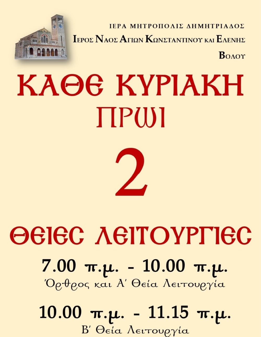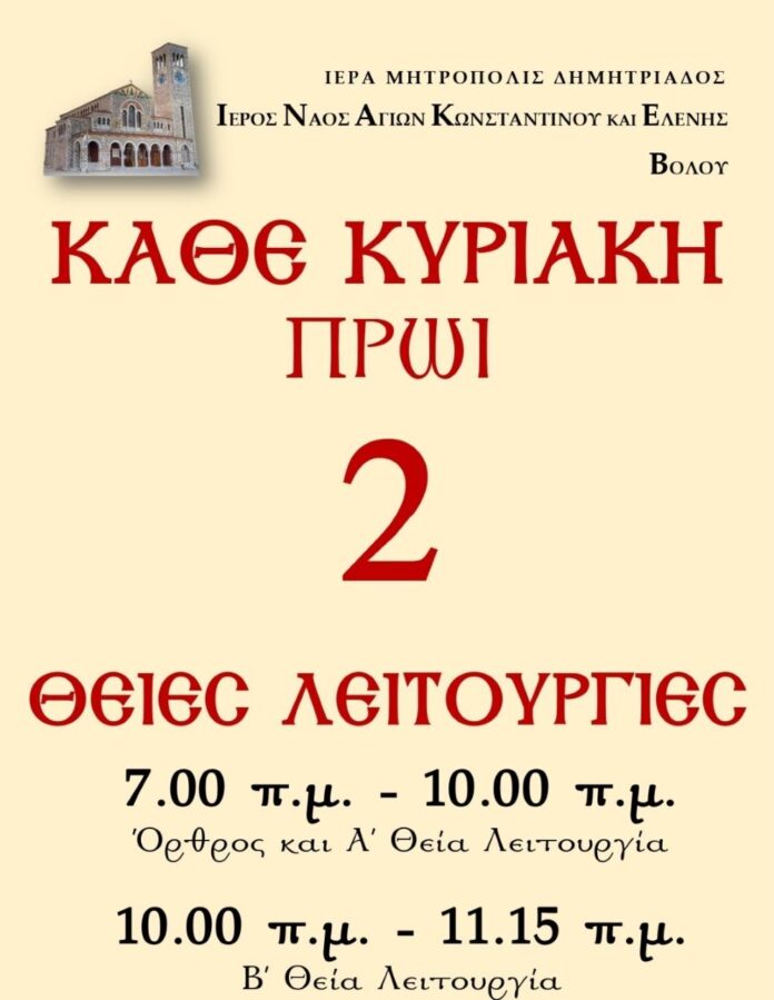 Για την καλύτερη εξυπηρέτηση των πιστών, από την Κυριακή 6/10, θα τελείται 2η Θεία Λειτουργία στον Ιερό Ναό Αγίων Κωνσταντίνου & Ελένης Βόλου από τις 10.00 π.μ. έως τις 11.15 π.μ., ενώ στον Μητροπολιτικό Ναό Αγίου Νικολάου Βόλου η τέλεση 2ης Θείας Λειτουργίας θα ξεκινήσει την Κυριακή 13/10 η οποία θα αρχίζει στις 10.15 π.μ.