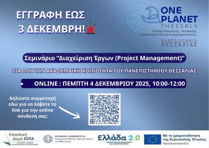 Η Μονάδα One Planet Thessaly του Πανεπιστημίου Θεσσαλίας, στο πλαίσιο του έργου «Στρατηγική Αριστείας του Πανεπιστημίου Θεσσαλίας – Ανάπτυξης Κέντρου Καινοτομίας / Επιχειρηματικότητας» (SUB2: «Πανεπιστήμια Αριστείας» – ΤΑ 5180665), διοργανώνει διαδικτυακό σεμινάριο με θέμα «Διαχείριση Έργων (Project Management)», την Πέμπτη 4 Δεκεμβρίου από τις 10:00 ως τις 12:00.