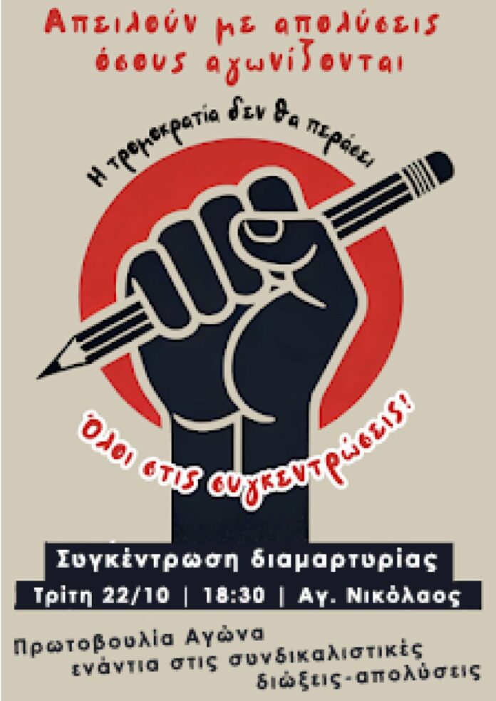 «Καταγγέλλουμε την πρωτοφανή κυβερνητική ενέργεια να προετοιμάσει απολύσεις σε τρεις αγωνιστές εκπαιδευτικούς της ΕΛΜΕ Πειραιά. Είναι τέτοια η υστερία της κυβέρνησης που ούτε καν περιμένει την εκδίκαση των πειθαρχικών που έχουν στηθεί και στοχοποιούν τη συνδικαλιστική δράση, και βιάζεται να τους βγάλει προκαταβολικά σε αργία.