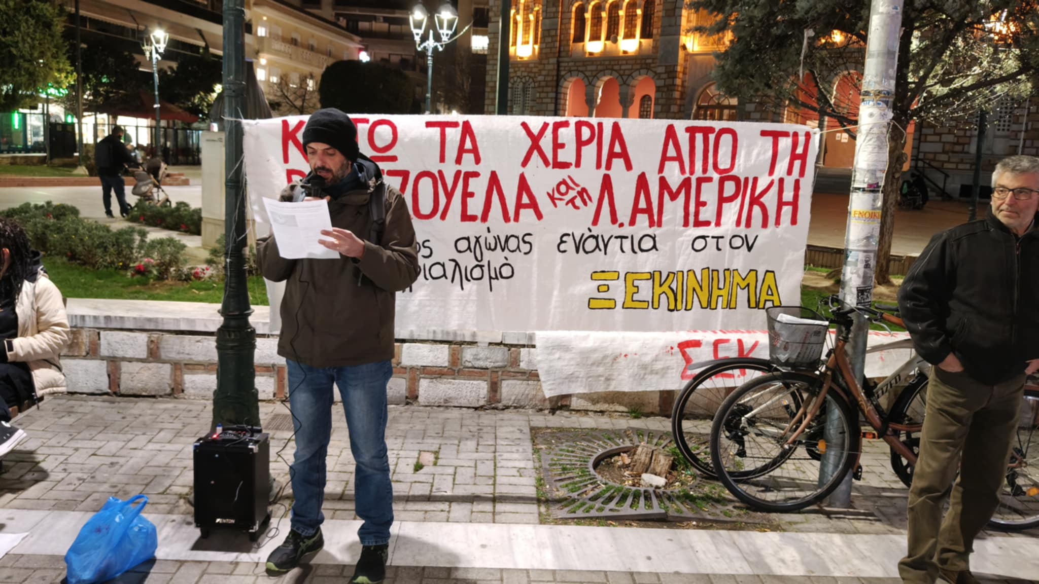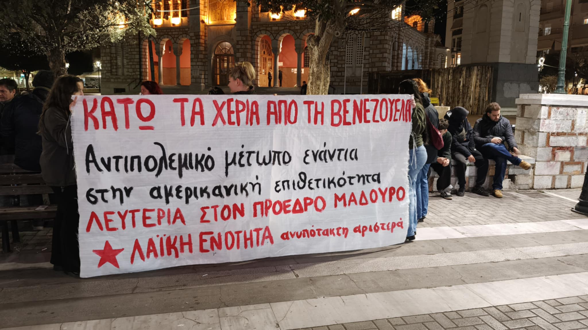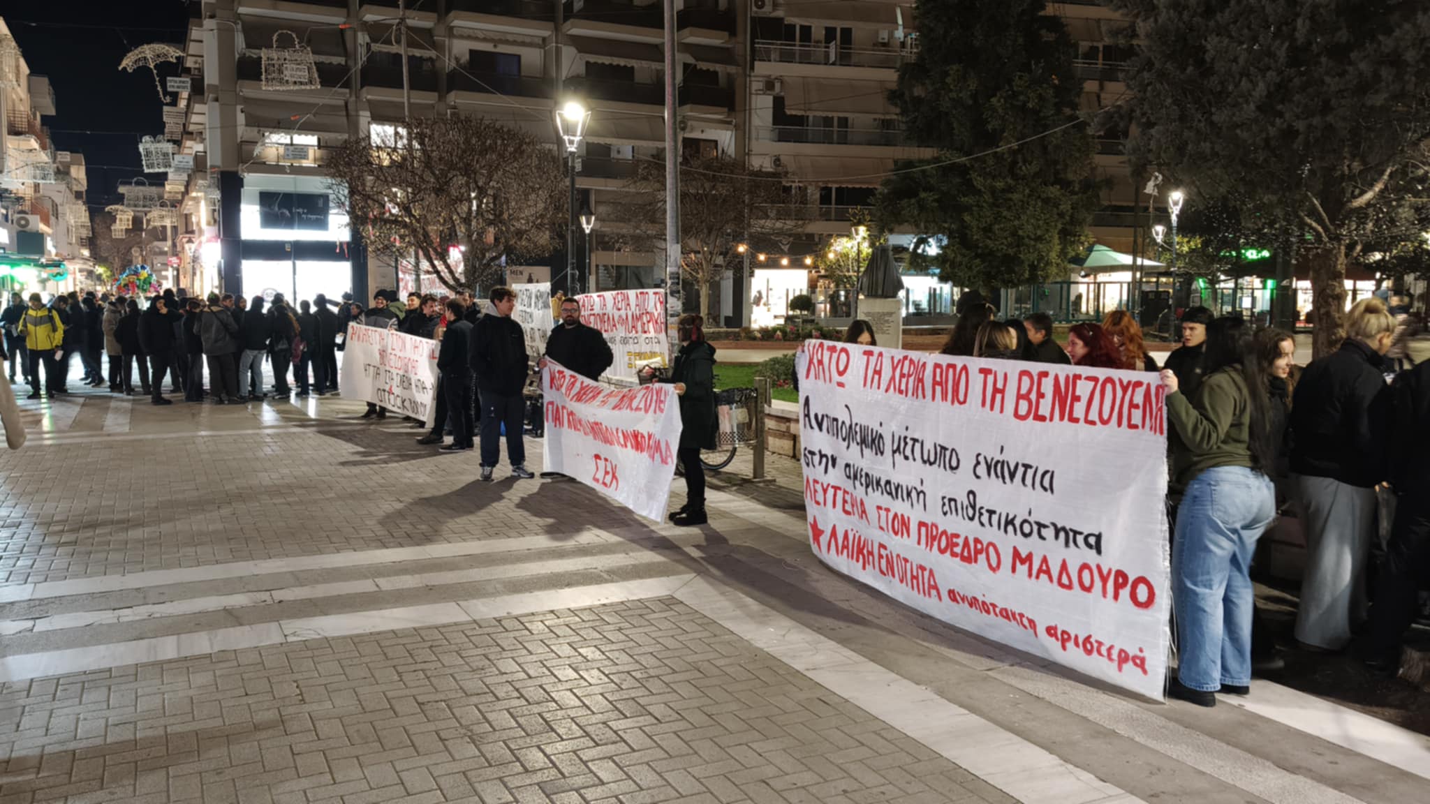 Συγκέντρωση διαμαρτυρίας πραγματοποίησαν σήμερα γύρω στις 6 το απόγευμα στην πλατεία Αγίου Νικολάου, μέλη κομμάτων της εξωκοινοβουλευτικής αριστεράς θέλοντας να εκφράσουν την αντίθεσή τους στην αμερικανική επέμβαση στη Βενεζουέλα που κατέληξε, όπως λένε, στην απαγωγή του προέδρου της χώρας Νικολάς Μαδούρο.