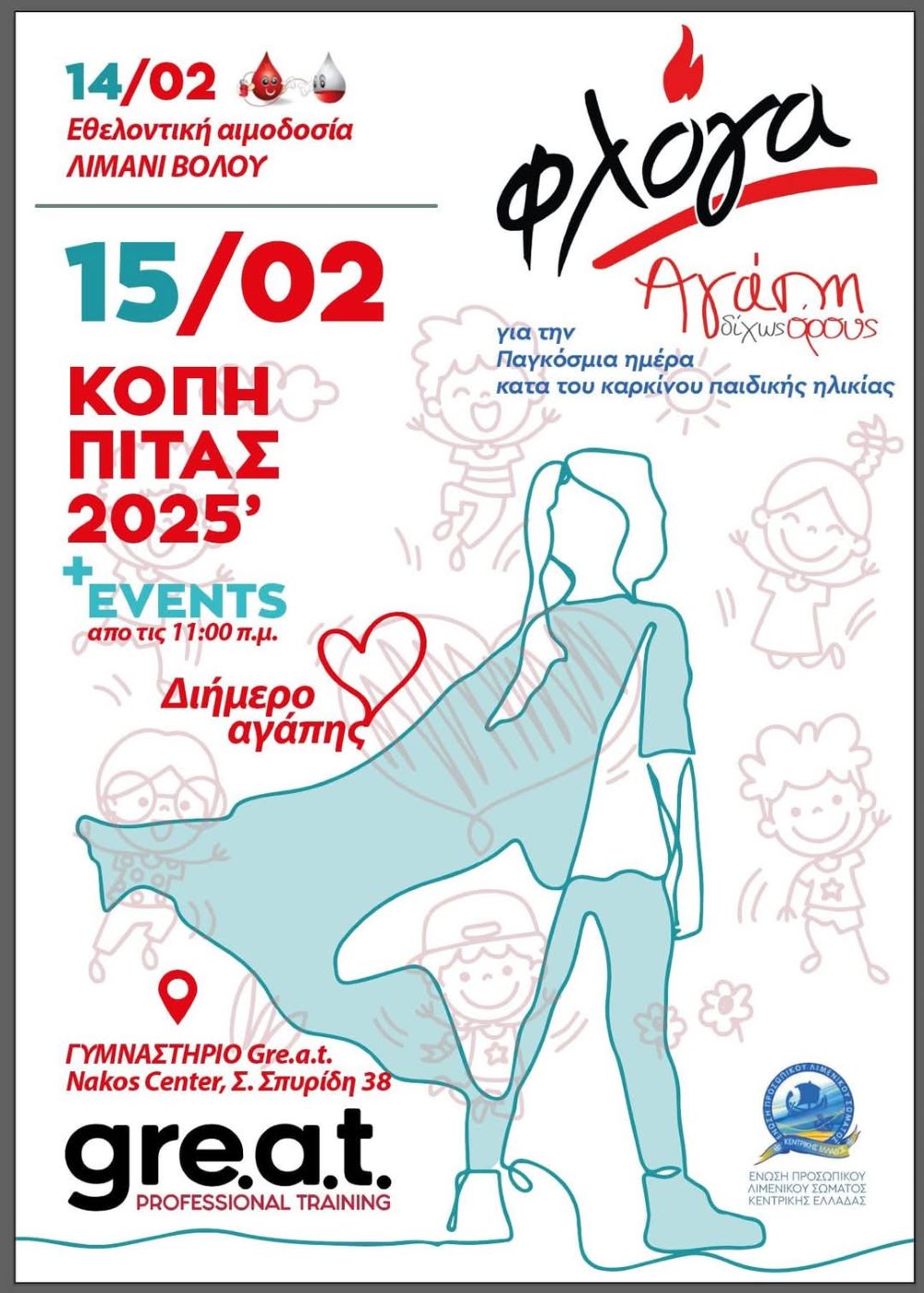 Η Φλόγα, ο Σύλλογος Γονέων Παιδιών με Νεοπλασματική Ασθένεια με τη βοήθεια του γυμναστηρίου GRE.A.T. και της Ένωσης Προσωπικού Λιμενικού Σώματος Κεντρικής Ελλάδας, για ακόμη μια φορά και με αφορμή την παγκόσμια ημέρα κατά του καρκίνου παιδικής ηλικίας δίνουν ηχηρό παρών με ένα διήμερο αγάπης στις 14 και 15 Φλεβάρη με αιμοδοσία στην παραλία του Βόλου αλλά και αθλητικές δραστηριότητες.