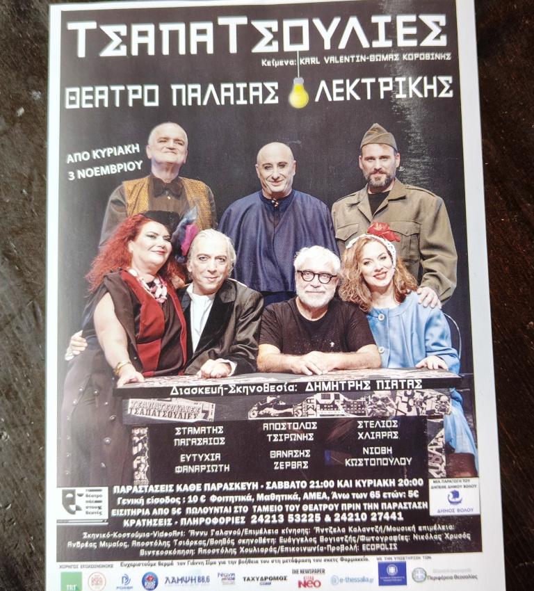 Πρεμιέρα την Κυριακή στο θέατρο της Παλιάς Ηλεκτρικής για την παραγωγή του ΔΗΠΕΘΕ «Τσαπατσουλιές», η οποία μετά τον Βόλο θα παιχτεί στα χωριά του Δήμου Βόλου, φιλοδοξεί να πάει στις άλλες θεσσαλικές πόλεις ακόμη και στην Αθήνα, όπως επισημάνθηκε σε συνέντευξη Τύπου, παρουσία της αντιδημάρχου Πολιτισμού και Μουσείων Έλενας Αντωνοπούλου, του καλλιτεχνικού διευθυντή Δημήτρη Πιατά και των συντελεστών της παράστασης του Καρλ Βάλεντιν.