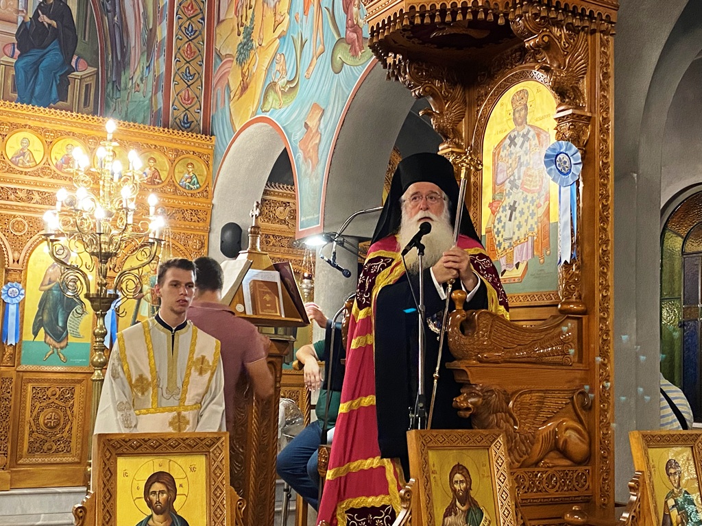 Στο κήρυγμά του, ο Σεβασμιώτατος μοιράστηκε την εμπειρία του από την προσκυνηματική του επίσκεψη στη Βόρειο Ήπειρο: «Με ιδιαίτερη συγκίνηση προσεύχομαι μαζί σας τούτη τη χρονιά στον Εσπερινό της εορτής του Αγίου Κοσμά του Αιτωλού. Είχα την εκπλήρωση ενός τάματος να είμαι προσκυνητής εκεί όπου Άγιος κήρυξε, μαρτύρησε και ετάφη, στα χώματα της Βορείου Ηπείρου που σήμερα είναι το κράτος της Αλβανίας. Με προσκυνητές από την πόλη μας και τη Μητρόπολή μας, με νέα παιδιά από τα στελέχη των κατασκηνώσεων, ζήσαμε συγκλονιστικές εμπειρίες για πέντε ημέρες». Και συνέχισε: «Η πιο σημαντική στιγμή ήταν όταν βρεθήκαμε στο μοναστήρι που επισκεπτόταν ο Άγιος, στα ερείπια της εκκλησίας που καταστράφηκε το 1967 όταν το κράτος κηρύχθηκε άθεο. Όμως διασώθηκε ο τόπος. Σήμερα είναι ένα συγκροτημένο μοναστήρι, διασώζεται το σημείο του τάφου του, υπάρχει το ποτάμι όπου βρέθηκε, κι έτσι πήραμε τη χάρη του και πατήσαμε στα χώματα αυτά που και εκείνος πάτησε, δίδαξε, ίδρυσε σχολεία, ανήγειρε ναούς και αναπτέρωσε το πνεύμα των ανθρώπων, χαρίζοντάς τους την πίστη στην Ανάσταση του Χριστού και στην Ανάσταση της πατρίδας».