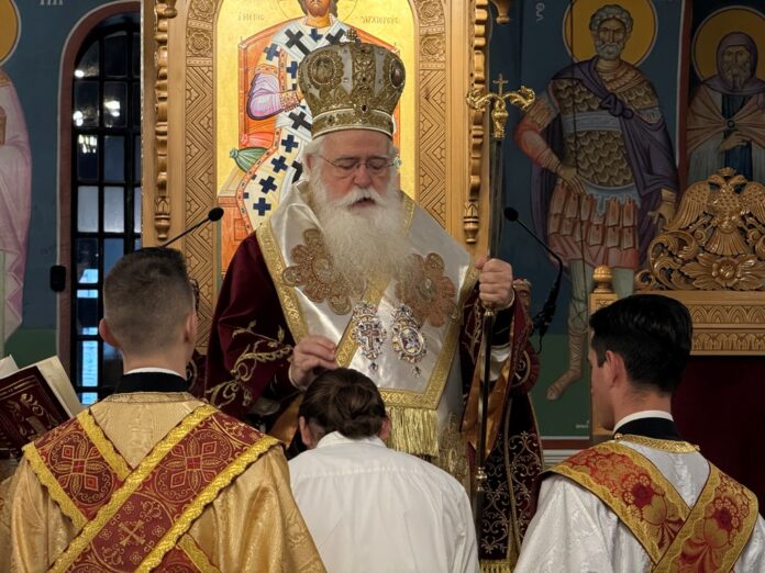 Νωρίτερα, ο Σεβασμιώτατος τέλεσε την εις Αναγνώστην χειροθεσία του μαθητού της Β΄ Λυκείου Αχιλλέα Ποθητού. Ο Σεβασμιώτατος αναφέρθηκε στην ομάδα των Αναγνωστών και Ιεροπαίδων, η οποία λειτουργεί στην Τοπική μας Εκκλησία με τρόπο οργανωμένο, υπό την πνευματική καθοδήγηση του εκάστοτε Αρχιδιακόνου: «Διατηρούμε χρηστές ελπίδες γι’ αυτά τα παιδιά, στα πρόσωπα των οποίων βλέπουμε τους εαυτούς μας, καθώς κάπως έτσι ξεκινήσαμε κι εμείς. Τα παιδιά αυτά προέρχονται από χριστιανικές οικογένειες και αυτό είναι μεγάλο προνόμιο». Κάλεσε τον νέο Αναγνώστη να κρατήσει και να επαυξήσει τα τάλαντα που του χάρισε ο Θεός, αντιπροσφέροντάς τα σ’ Εκείνον με όποιον τρόπο επιλέξει. Ζήτησε, τέλος, από τον λαό να προσεύχεται, ώστε να αναδεικνύει ο Θεός τέκνα Του αφοσιωμένα στην Εκκλησία από την παιδική τους ηλικία.