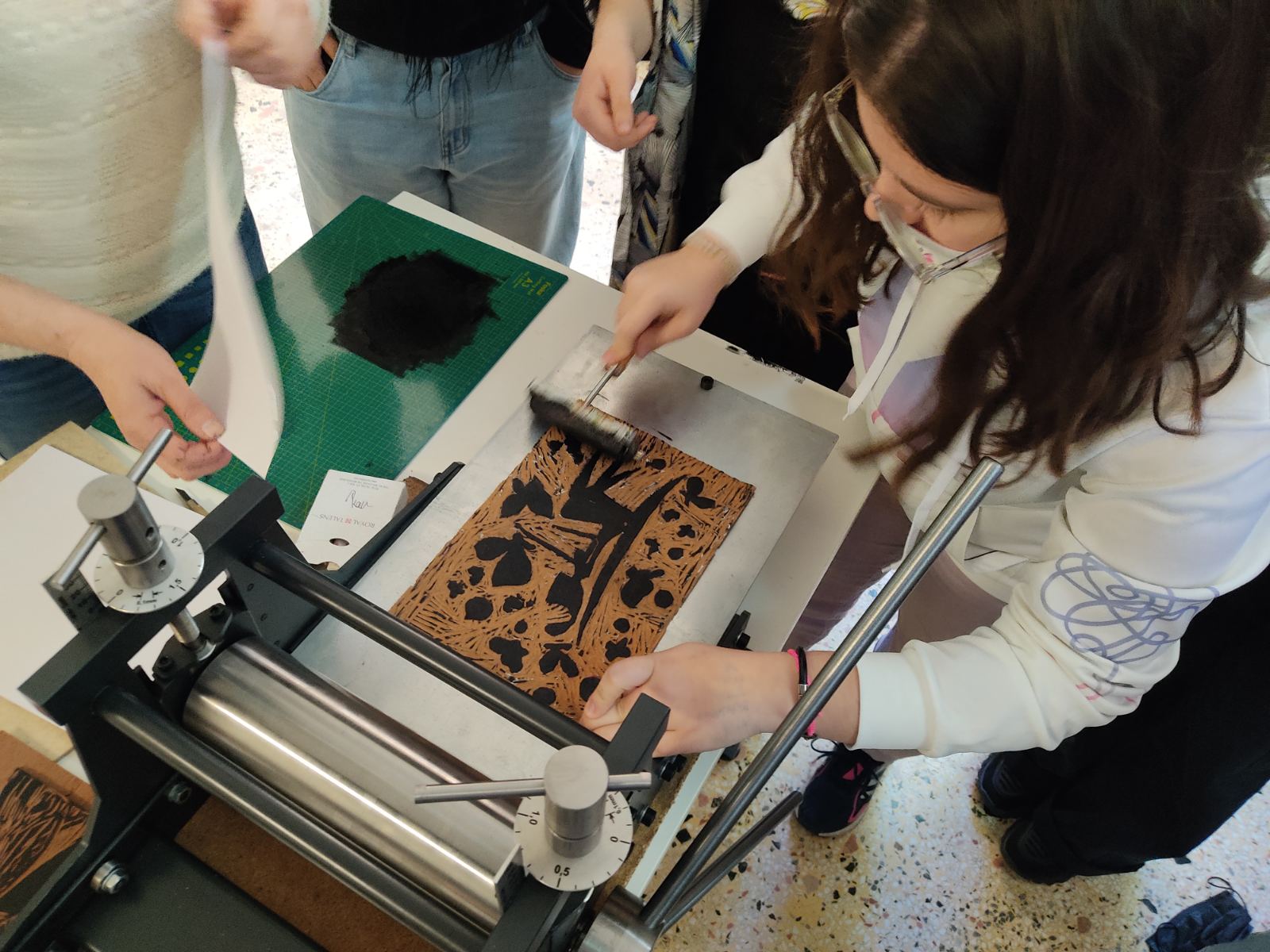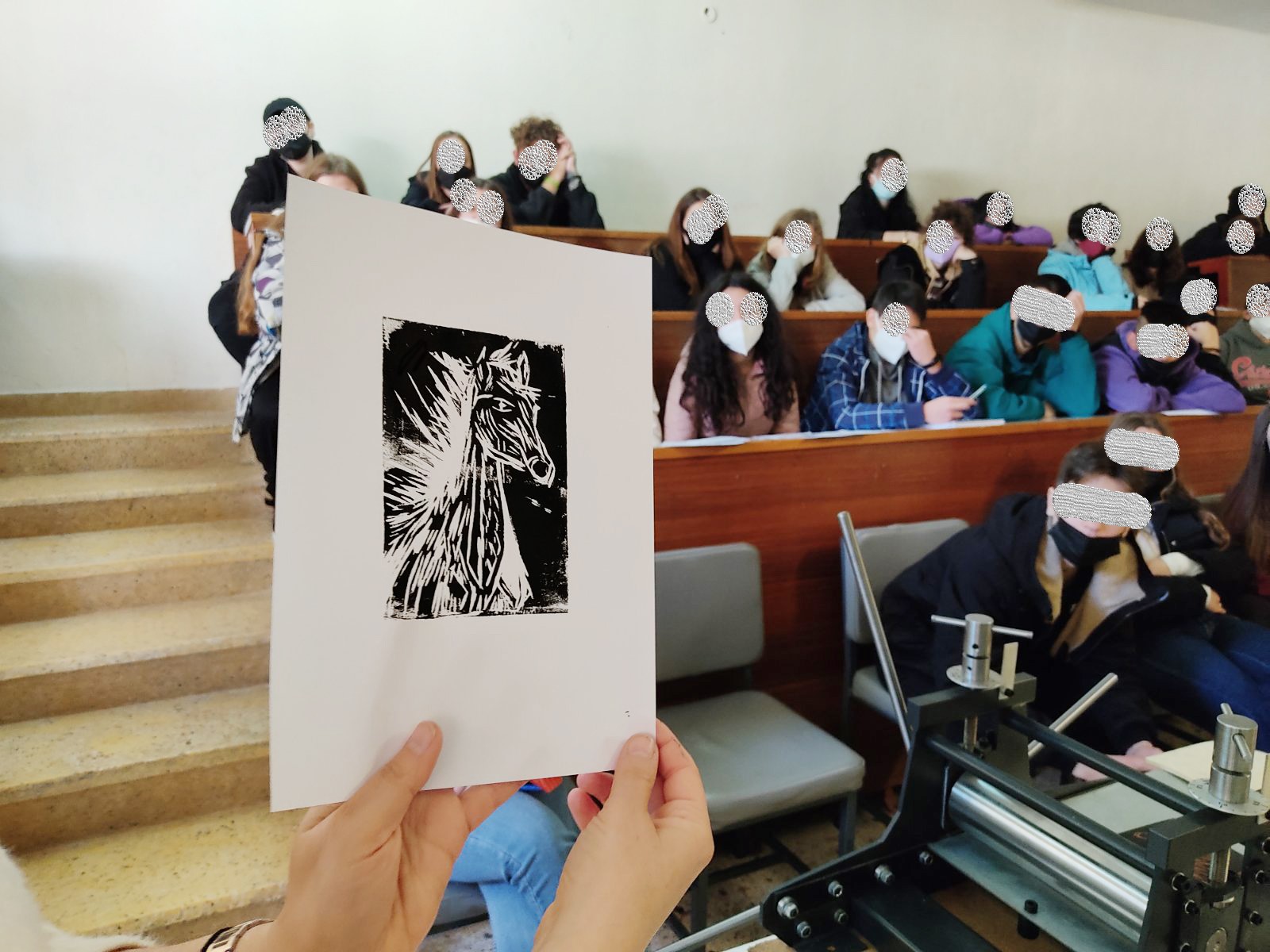 Στο τέλος της εκδήλωσης, έγινε η παρουσίαση της νέας πρέσας χαρακτικής που απέκτησε το σχολείο, με τη χρηματοδότηση του προγράμματος ΜΝΑΕ, για να εκτυπωθούν τα σχέδια των μαθητών που θα συνοδεύσουν τις αφηγήσεις.