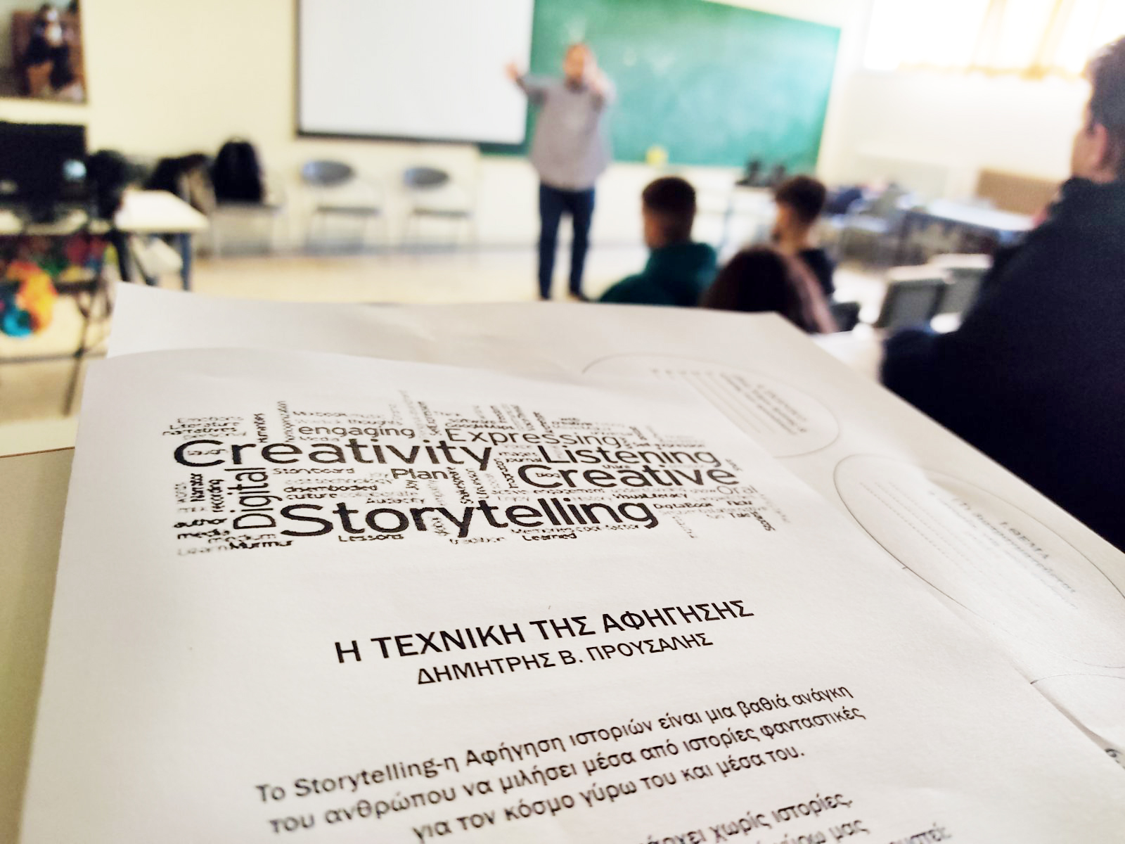 Στη συνέχεια, παρουσίασε στους μαθητές τεχνικές αφήγησης και δημιουργήθηκαν με τη βοήθεια του μικρές αυτοσχέδιες αφηγήσεις. Η εισήγησή του ολοκληρώθηκε με την ευγενική πρόσκλησή του να παρουσιαστούν τα παραμύθια που θα δημιουργήσουν οι μαθητές μας τον ερχόμενο Αύγουστο στις παράλληλες δράσεις του 12ου Φεστιβάλ Αφήγησης στον Άγιο Γεώργιο Νηλείας.