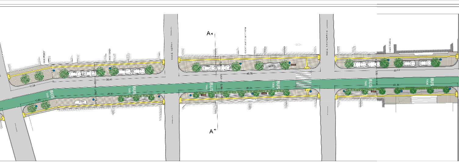 Προτείνεται από τη Διεύθυνση Τεχνικών Υπηρεσιών η διατήρηση μιας λωρίδας κυκλοφορίας για τα οχήματα και μιας λωρίδας για αποκλειστική διέλευση λεωφορείων και ταξί. Το πλάτος της οδού που απομένει θα χρησιμοποιηθεί για την διαπλάτυνση και ανακατασκευή των πεζοδρομίων με χρήση βιοκλιματικών υλικών.